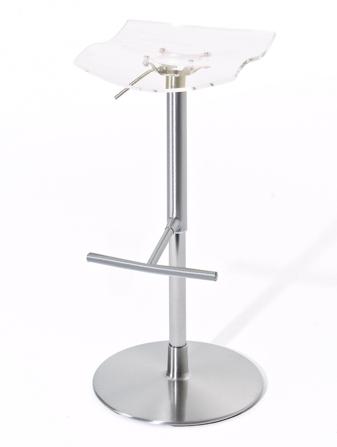 In hoogte verstelbare kruk met frame van aluminium en staal, stalen zuiger en draaibare zitting van transparant methacrylaat.
