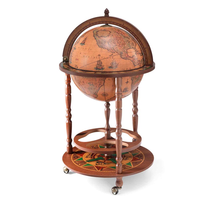 Deze elegant afgewerkte globe, vervaardigd door onze deskundige vaklieden, heeft drie stevige poten van beukenhout en een voetstuk versierd met natuurlijke, watergedragen verf, die een kompasroos voorstelt. De bol kan zowel in gesloten als open toestand om zijn meridiaan draaien en is voorzien van een antieke kaart , een getrouwe reproductie van een 16e-eeuwse cartografie. De binnenkant van het noordelijk halfrond is versierd met afbeeldingen van de sterrenbeelden .