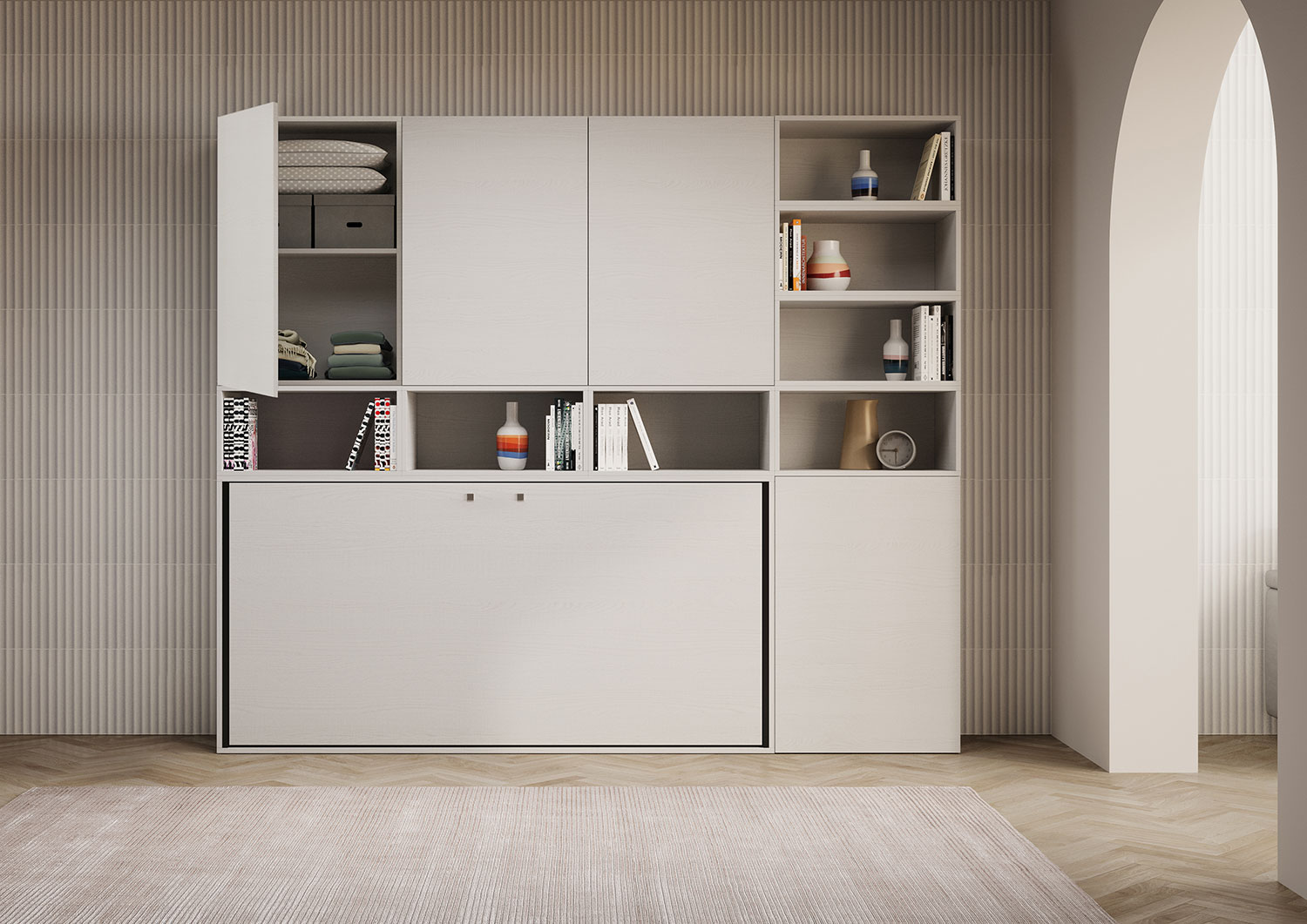 | Materiaal | Kando E is een opklapbaar eenpersoonsbed in een boekenkast/kledingkast met elf vakken (vier met deuren en interne planken en zeven open vakken). Dit is een originele en functionele oplossing waarmee je de beschikbare ruimte optimaal kunt benutten, en die |