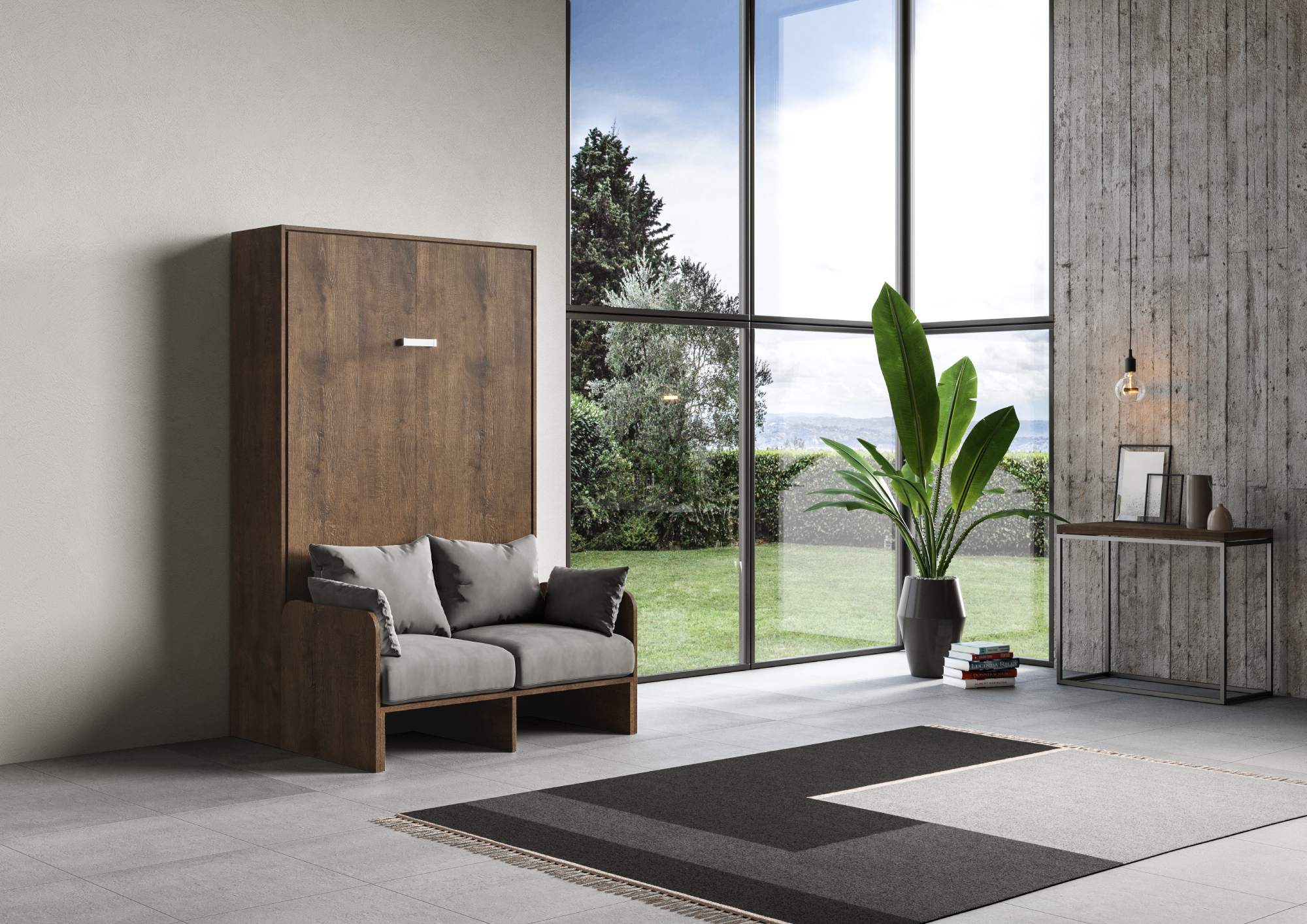 Het Kentaro Sofà queensize verticale wandbed van 120 cm is een origineel idee dat, dankzij de toevoeging van een bank, de woonkamer in slechts enkele eenvoudige stappen transformeert in een slaapkamer. Een perfecte oplossing voor studio's en kleine ruimtes waar elke vierkante meter telt: met dit slimme model optimaliseert u uw ruimte zonder in te leveren op comfort, gemak en design. De bankkussens, met volledig afneembare hoezen, zijn gemaakt van microvezel. De kleur van de bekleding kunt u kiezen uit de beschikbare kleuren in de afbeeldingengalerij. Het bed- en bankframe is gemaakt van 18 mm dik spaanplaat met een melamine coating. Het onderstel is gemaakt van versterkt ijzer, epoxy gepoedercoat in een reliëf aluminiumkleur. Inclusief een lattenbodem van 123 x 190 cm van beukenhout met matrasbanden. Het bed wordt neergelaten door gasveren en is voorzien van een handgreep. Matras niet inbegrepen. Aanbevolen matrasafmetingen: L. 120 B. 190 H. 22 cm. Maximale bedbelasting: 180 kg. Let op: Het Kentaro Sofà wandbed wordt gedemonteerd geleverd. Montage is zeer lastig en vereist twee ervaren personen. Wandmontage is verplicht. Afmetingen: Gesloten bed: L.133,6 D.105,2 H.210,5 cm. Uitgeklapt bed: L.133,6 D.215 H.210,5 cm. Hoogte van de basis vanaf de vloer: 22 cm. Maximale matrashoogte: 24 cm. Gemaakt in Italië. Product van Itamoby.