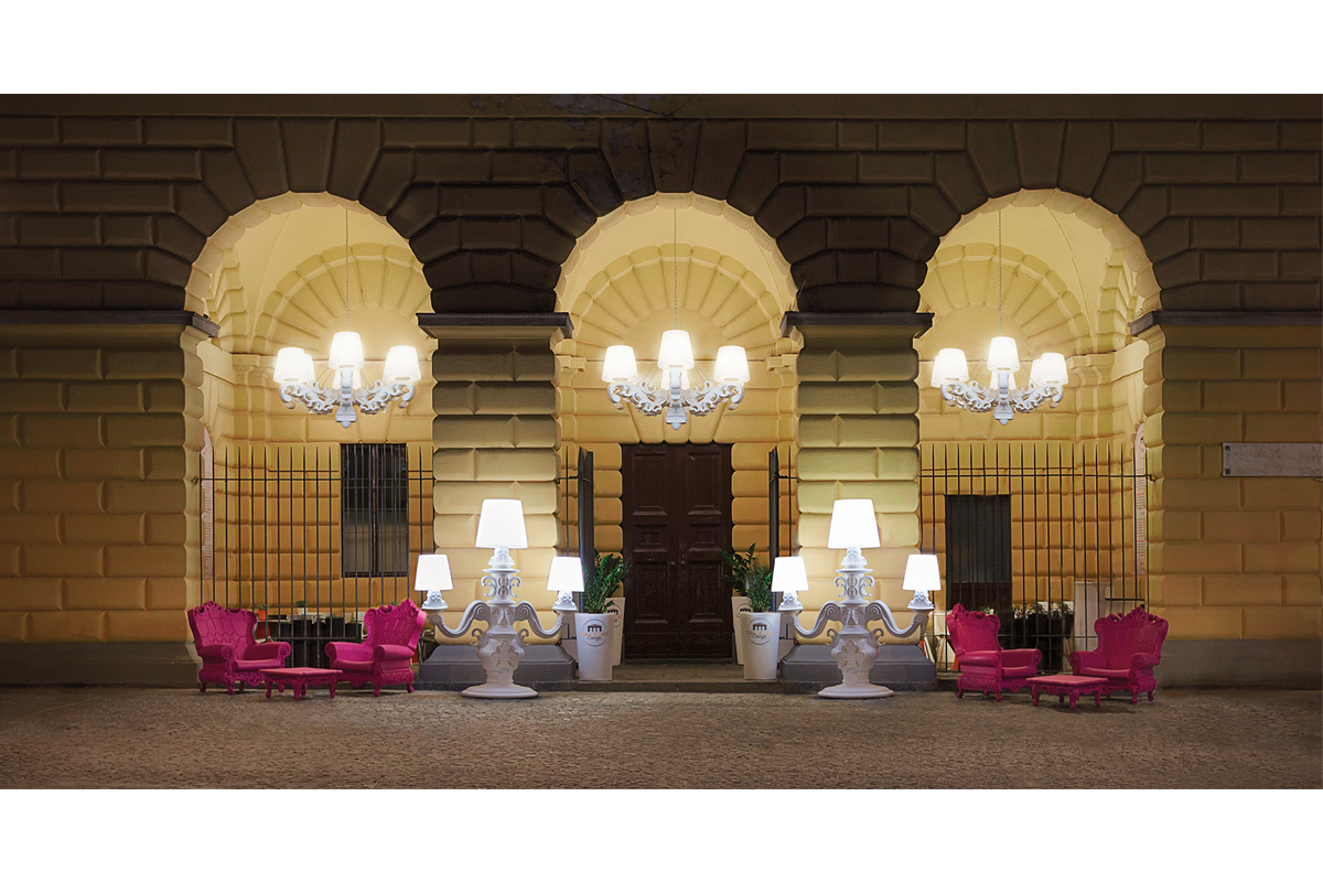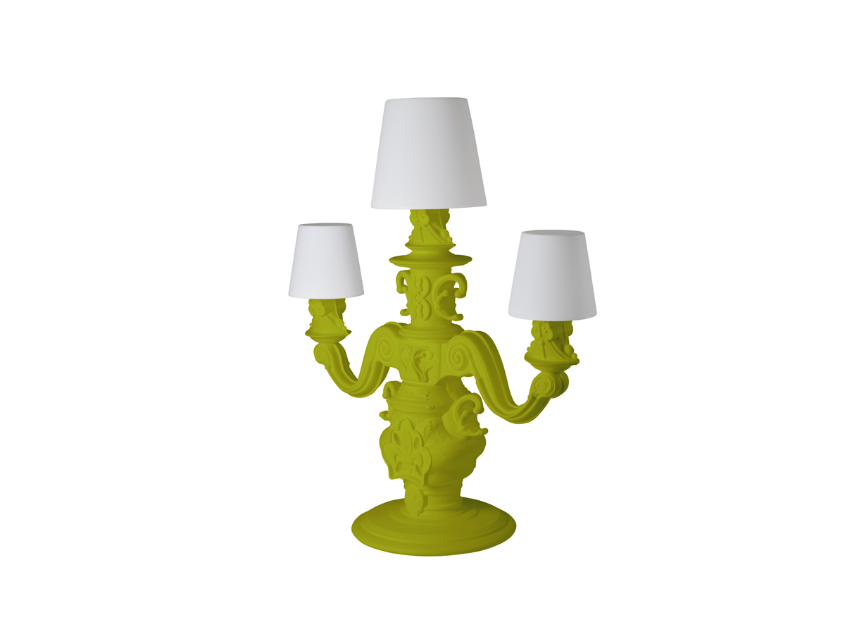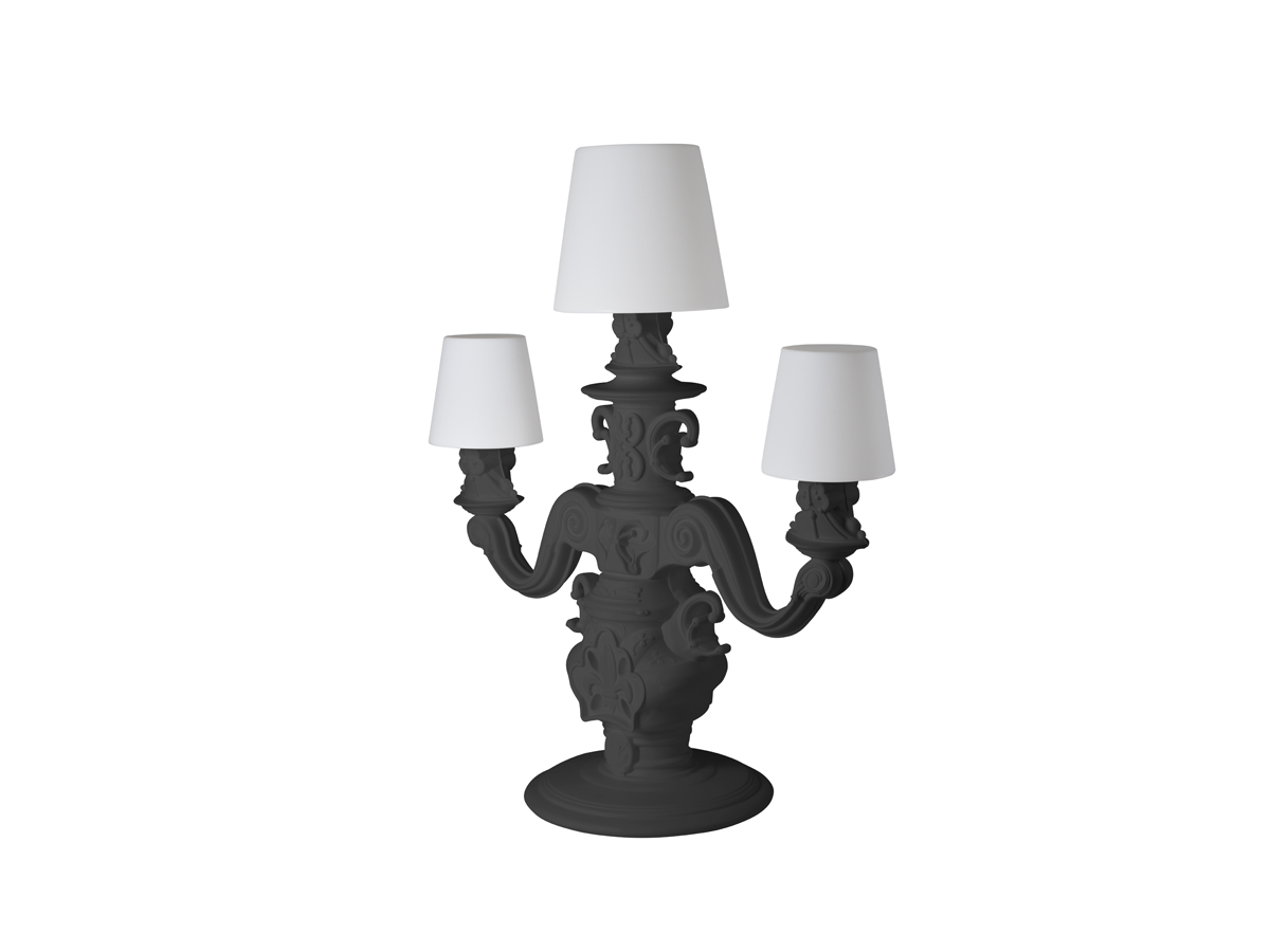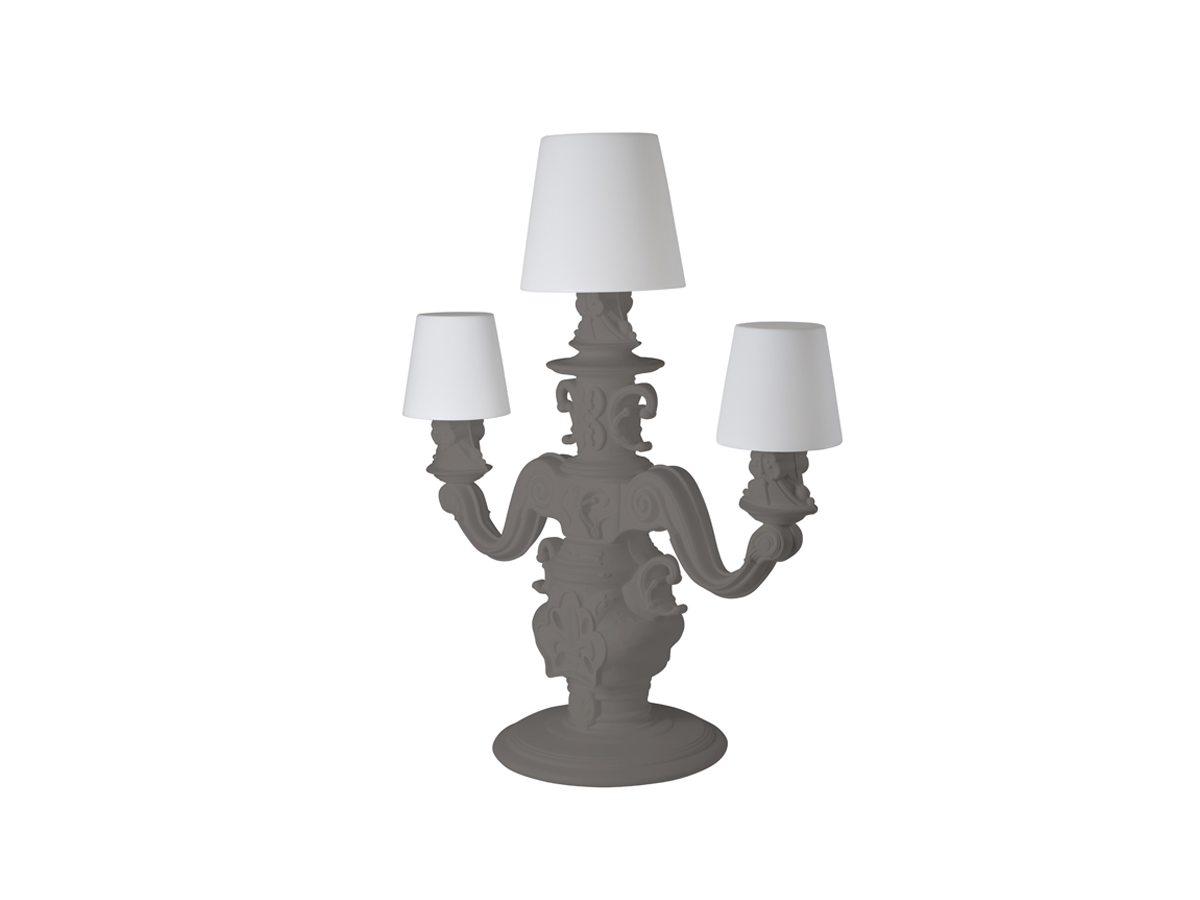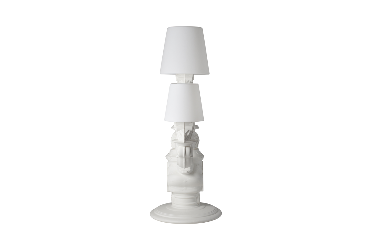 De King of Love vloerlamp, ontworpen door Graziano Moro en Renato Pigatti, maakt deel uit van de Design of Love collectie. De voet van de lamp is uitgevoerd in barokstijl, terwijl de drie grote, lichtgevende witte lampenkappen een majestueuze uitstraling hebben en een innovatief detail bezitten: het polyethyleen is behandeld met een unieke oppervlakteafwerking met een klassiek motief, voor een verfijnde, elegante en tactiele decoratie.