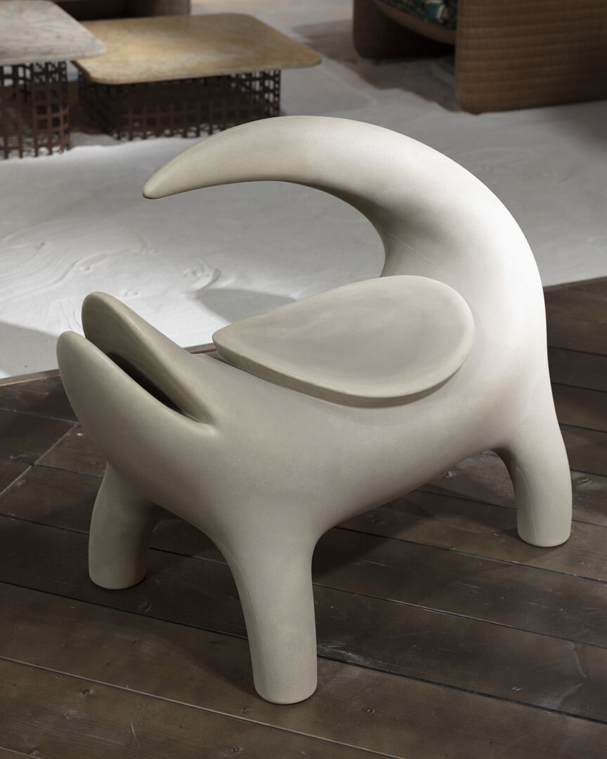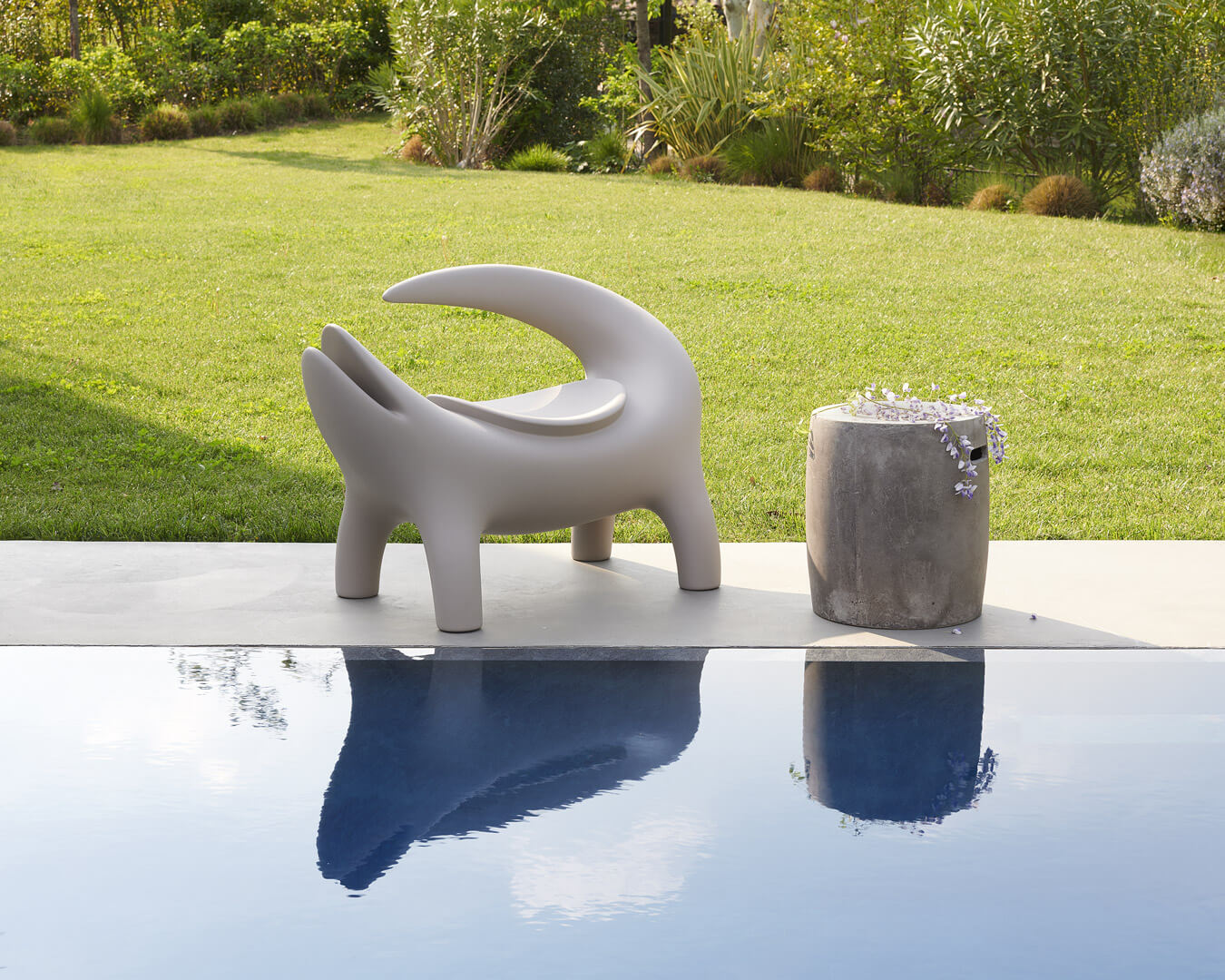 Marcantonio transformeert een van de meest iconische dieren tot de ideale metgezel voor ontspanning in de buitenlucht. Kroko, winnaar van de GREEN GOOD DESIGN award 2022, is een loungestoel waarvan de afgeronde lijnen een vleugje ironie toevoegen aan de ruimtes waarin hij staat. Dit industriële ontwerp, dat knipoogt naar beeldhouwkunst en verwijzingen naar de natuur en hedendaagse kunst, heeft een subtiele maar onmiskenbare vorm. Kroko is gemaakt van een bioplastic, gewonnen uit geraffineerd suikerriet, dat doet denken aan de kleuren van de aarde en dat SLIDE voor het eerst in de designwereld gebruikt. Kroko is ook verkrijgbaar als tweepersoonsversie, Big Kroko, en maakt deel uit van de Afrika-collectie, samen met Threebù, Threebù Pot, Threebù Totem en Threebù Party.