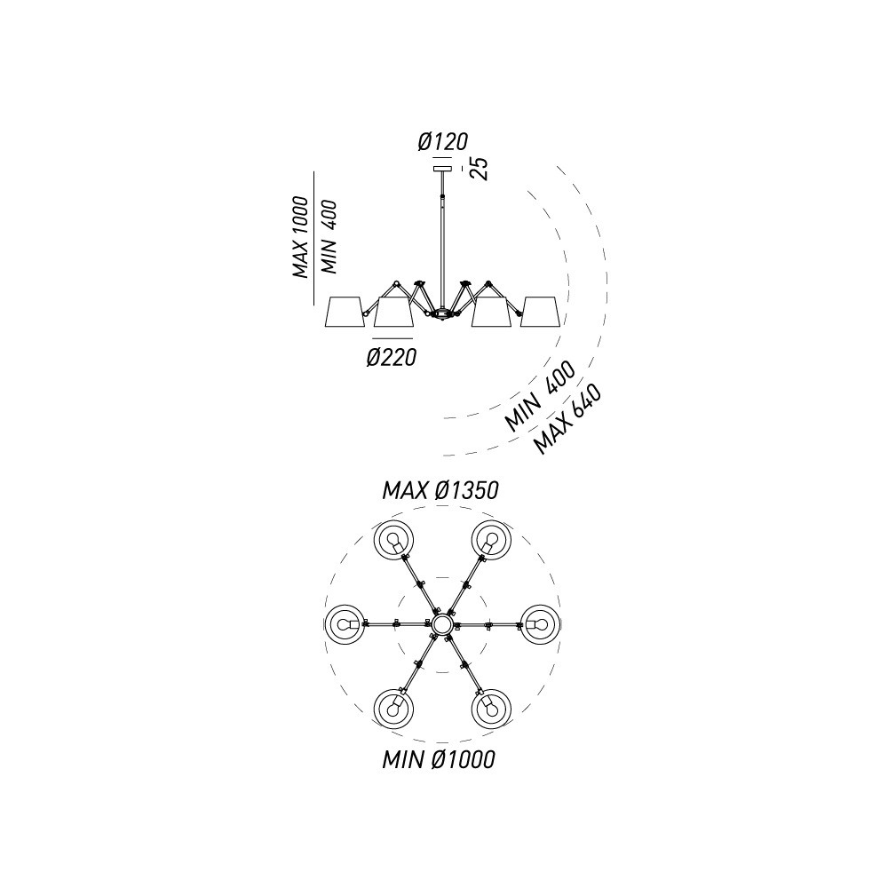 Diffuser: Ø220 mm; maximale ophanghoogte 1000 mm; maximale totale afmetingen 1350 mm; plafondrozet Ø120 mm