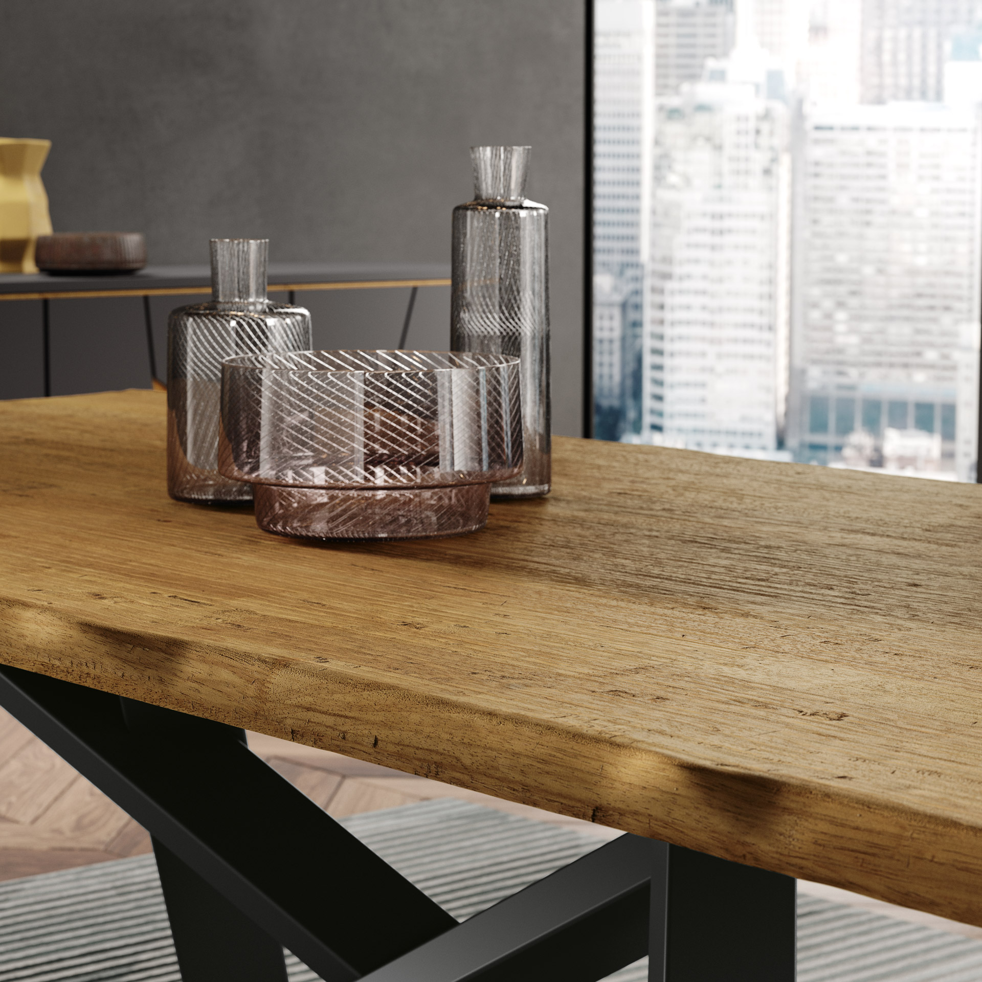 Het tafelblad is opgebouwd uit lasergesneden en elektronisch gelaste elementen in één geheel, wat niet alleen zorgt voor uitzonderlijke stabiliteit, maar ook voor een opvallende esthetiek. De tafelrand, gemaakt van echt hout, kan worden uitgevoerd met een vierkante afwerking voor een moderne look of met een onbewerkte rand om de natuurlijke uitstraling van het hout te benadrukken.