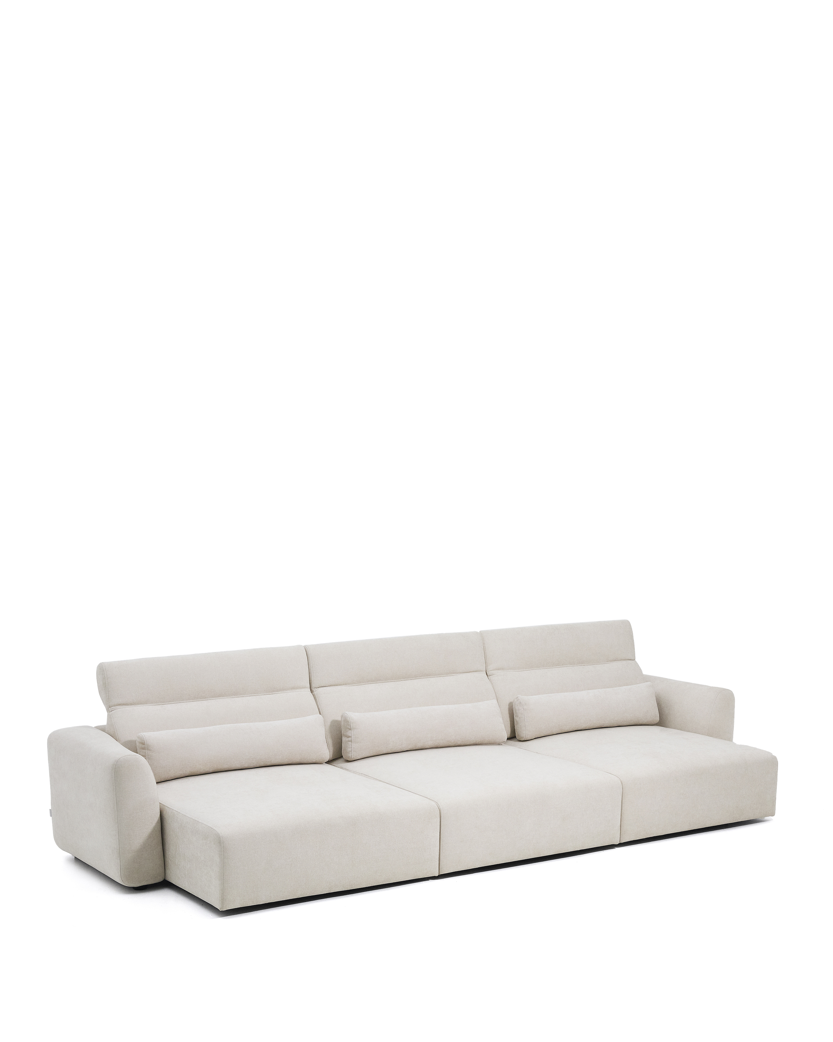 Deze bank combineert design, comfort en technologie in één meubelstuk. De gemotoriseerde zittingen en handmatig verstelbare hoofdsteunen stellen u in staat uw zithouding op elk gewenst moment aan te passen. Het is een compacte, uitschuifbare bank die de geringste diepte op de markt combineert met maximale uitschuifbaarheid in uitgeklapte toestand: in gesloten toestand meet de bank 99 cm diep en in uitgeklapte toestand tot wel 60 cm. De zitting kan in elke positie uitgeklapt blijven. De beweging kan worden bediend met een draadloze afstandsbediening of via een smartphone-app met Bluetooth, die een veilige modus voor gecontroleerd gebruik bevat. De chenille bekleding, met een fijne structuur, fluweelzachte textuur en uitstekende licht- en slijtvastheid, is machinewasbaar op een fijnwasprogramma. De stoffenleverancier is OEKO-TEX® STANDARD 100 gecertificeerd, wat een ecologisch veilige en milieuvriendelijke productie garandeert. De zitting combineert vanbinnen een NOSAG-veersysteem met lagen schuim met hoge dichtheid (35 kg/m³ en 40 kg/m³), 5 cm visco-elastisch materiaal van 42 kg/m³ en een laag vezels, wat resulteert in een middelzachte zitting. De hoofdsteunen hebben afneembare hoezen en zijn gevuld met zacht schuim van 35 kg/m³, superzacht schuim van 24 kg/m³ en vezels voor extra comfort. Deze in Europa vervaardigde bank biedt kwaliteit en duurzaamheid en draagt tegelijkertijd bij aan de vermindering van CO₂-uitstoot. Een ruim en veelzijdig meubelstuk, ontworpen om doordacht design en innovatie in uw dagelijks leven te brengen.