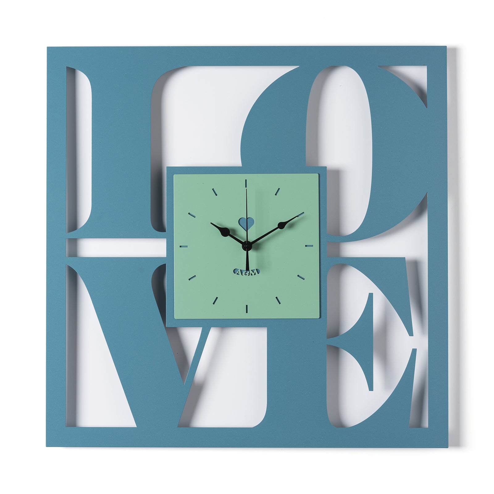 Het hart van het project is de kleinere centrale wijzerplaat, waarop de uren worden aangegeven door strakke, dunne lijnen. In het midden, net boven het snijpunt van de wijzers, bevindt zich een subtiel hartvormig symbool dat de emotionele boodschap van het object op ingetogen wijze benadrukt. Rondom is het woord "Love" gegraveerd met behulp van strakke, precieze perforaties: de letters "L" en "O" staan bovenaan het vierkant, terwijl "V" en "E" onderaan zijn geplaatst, wat een evenwichtig, eigentijds en visueel aantrekkelijk grafisch effect creëert.