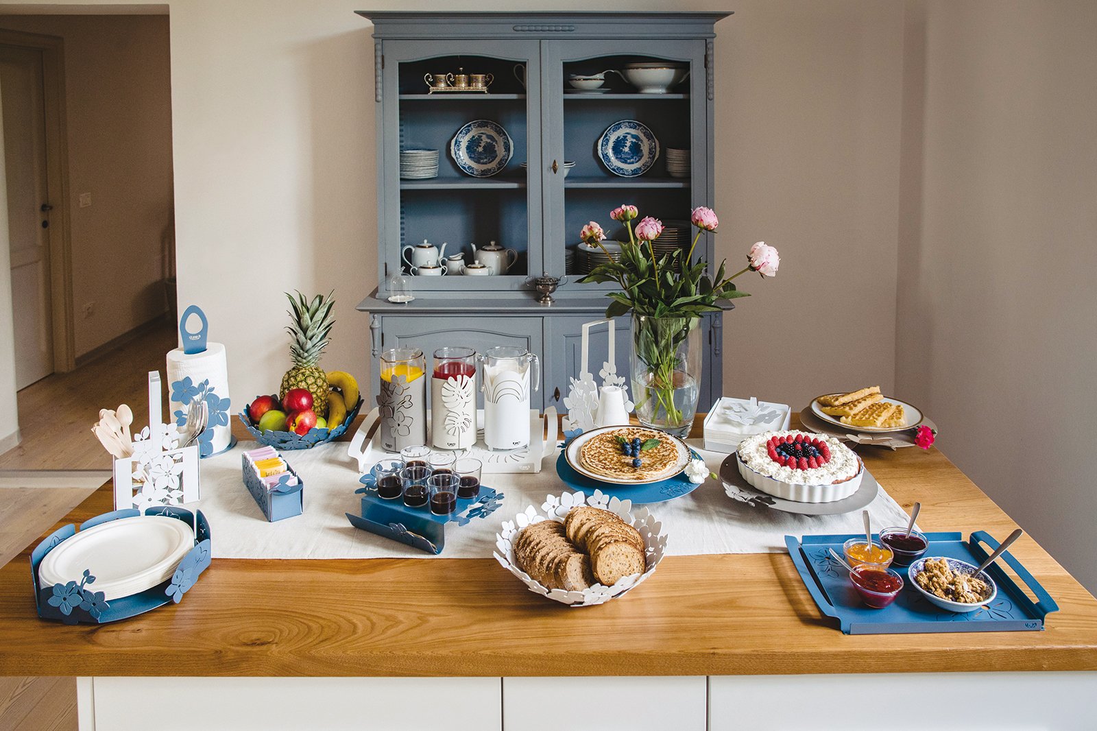 Verkrijgbaar in lichtblauw, marmerwit en modderkleur: uw keuken wacht op een nieuwe rolhouder met bloemenmotief, gemaakt in Italië, om echt bijzonder en trendy te worden.