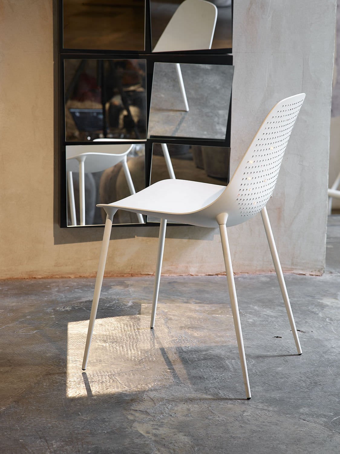 Stoel met gegoten aluminium schaal en gegalvaniseerd metalen frame, gelakt voor binnen- en buitengebruik, niet stapelbaar.