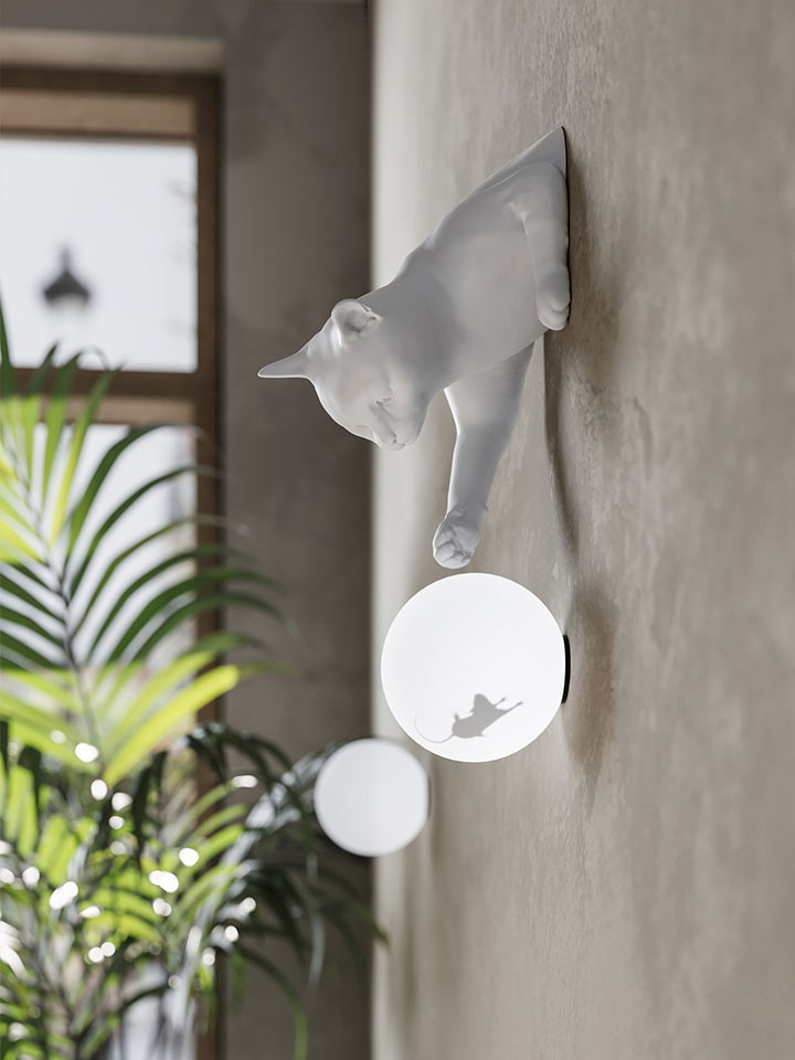 De kat lijkt uit de muur of van het tafelblad te springen om met zijn poot te spelen en de muis in de lichtbol te plagen.