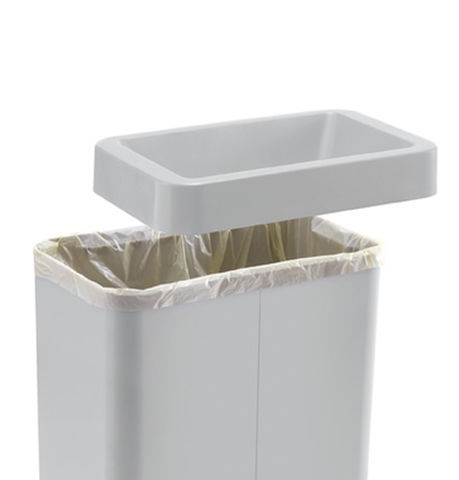 Verwijderbare bovenste zakhouder met centrale gleuf voor afvalverwijdering, volledig gemaakt van schokbestendig technopolymeer, voorzien van afgeronde veiligheidsranden. Verkrijgbaar in grijs, rood, groen, geel, blauw en wit.