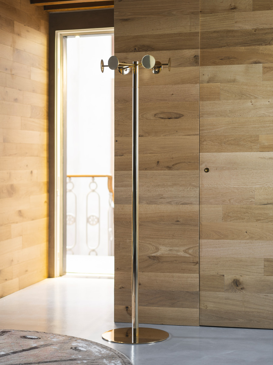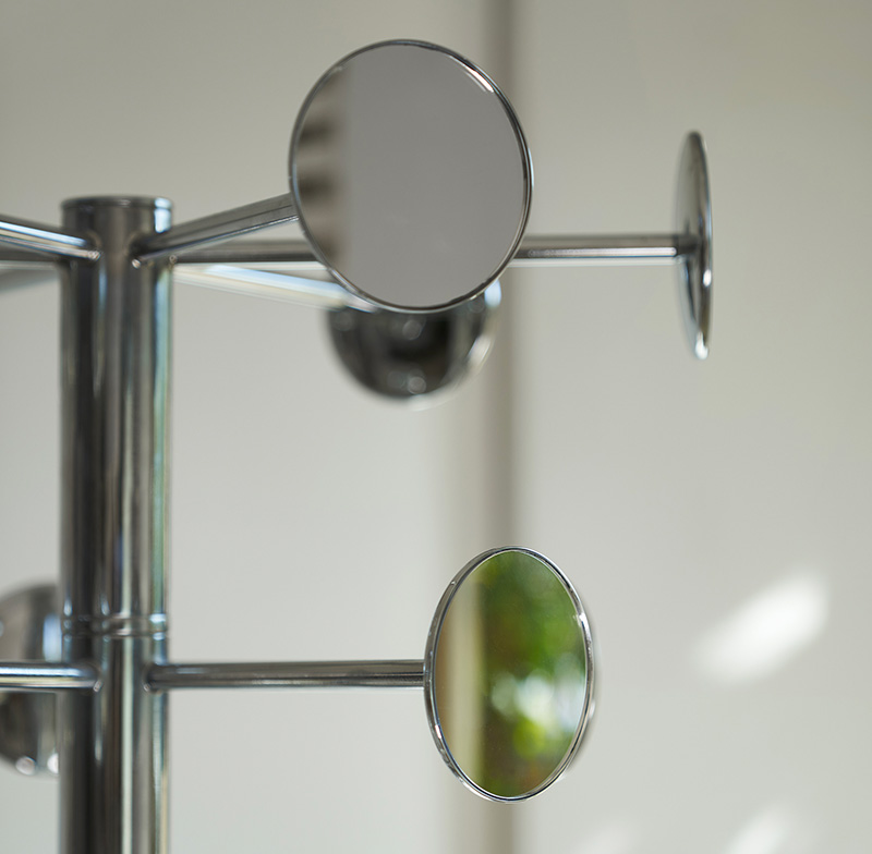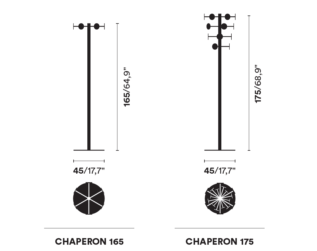 Chaperon is een kledinghanger ontworpen door Bruno Rainaldi voor Opinion Ciatti. Vrijstaande kledinghanger met een draaibare kroon, enkelvoudig (6 spiegels) H168 of met vier elementen (18 spiegels) H178. Verkrijgbaar in de volgende afwerkingen: chroom met zilveren spiegeling, goud met gouden spiegeling.