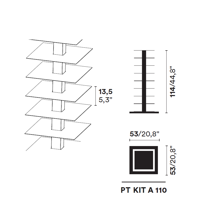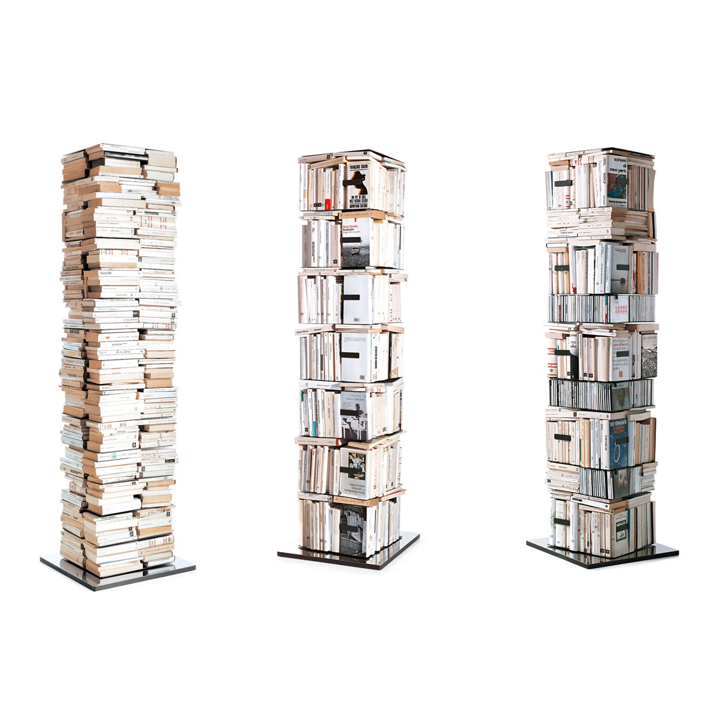 Vrijstaande, 360° draaibare verticale boekenkast. Voetstuk gegraveerd met de handtekening van de ontwerper. Verkrijgbaar in drie verschillende configuraties: Kit A, Kit B, Kit C. Afwerking: Structuur en planken in wit of zwart gelakt metaal. Voetstuk in gepolijst roestvrij staal voor de zwarte versie en wit gelakt voor de witte versie. Accessoires: Verlengstukken in wit of zwart gelakt metaal. Magnetische cd-houder. Afmetingen: 52x52xh110 cm. De prijs is voor configuratie A van 110 cm hoog, bestaande uit 8 planken met een tussenruimte van 13 cm, met boeken horizontaal geplaatst. In totaal 240 boeken, in totaal 680 cd's. Geef per e-mail aan info@tecnoarredo3.com aan of u de variant WIT MET WIT VOETSTUK of ZWART MET ROESTVRIJSTALEN VOETSTUK verkiest.
