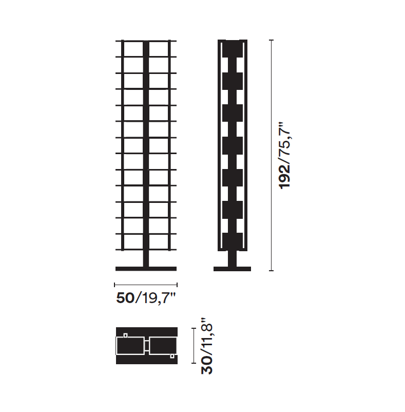 Vrijstaande verticale boekenkast. Kan ook gebruikt worden als dubbelzijdige scheidingswand. Bestaat uit een centrale staander en een dubbele rij planken van zwart of wit gelakt metaal, een voetstuk van gepolijst roestvrij staal of wit gelakt massief roestvrij staal. Twee gepolijste roestvrijstalen boekensteunen. Biedt plaats aan circa 170 boeken of 560 cd's. Het voetstuk is gegraveerd met de handtekening van de ontwerper. Ontworpen door Bruno Rainaldi. Afmetingen: 50 x 30 x 192 cm. Geef per e-mail aan info@tecnoarredo3.com aan of u de witte versie met een wit voetstuk of de zwarte versie met een roestvrijstalen voetstuk wenst.