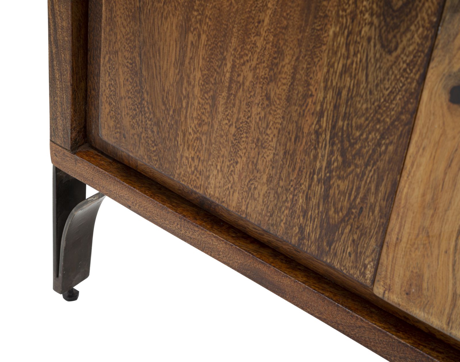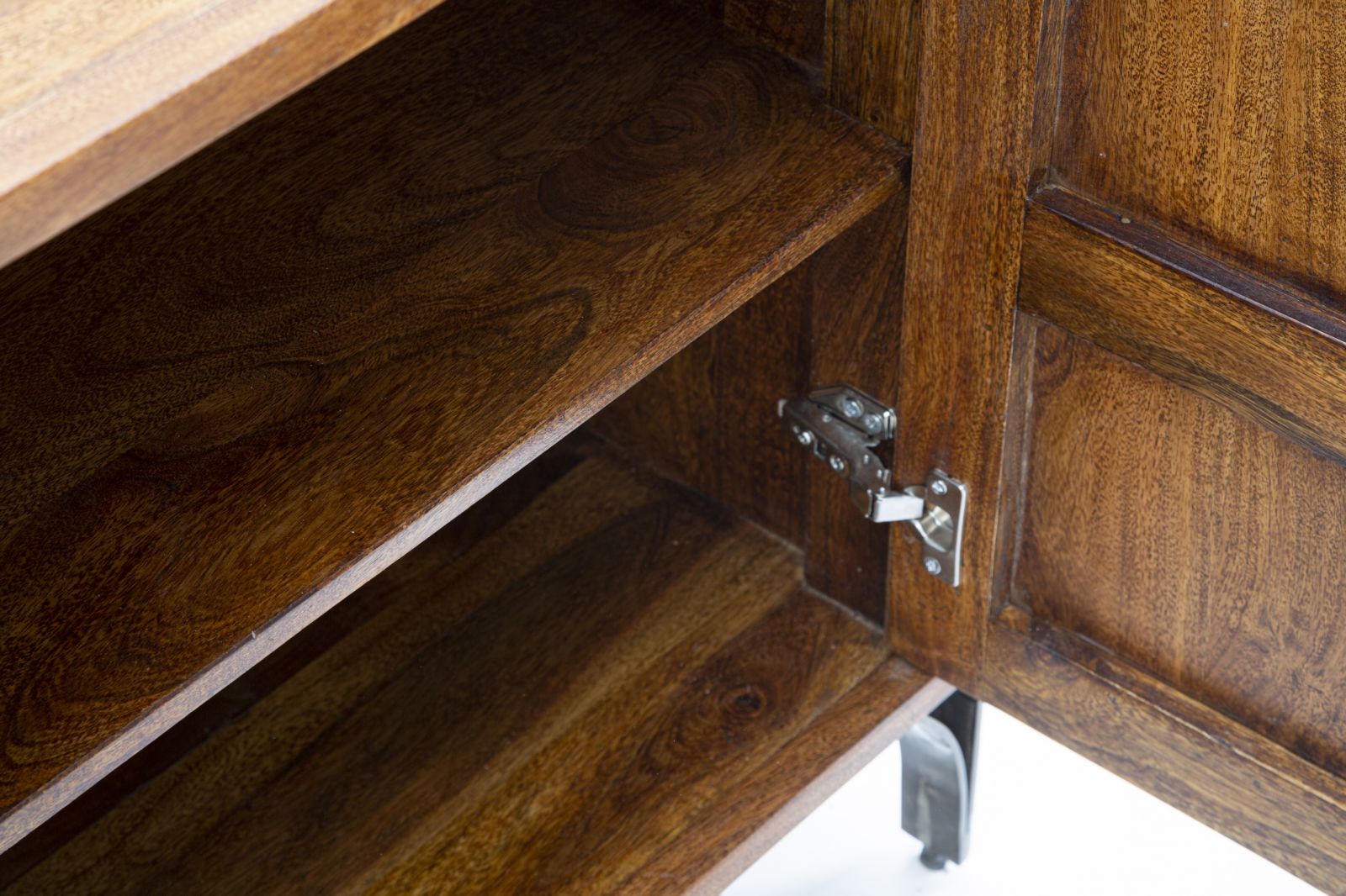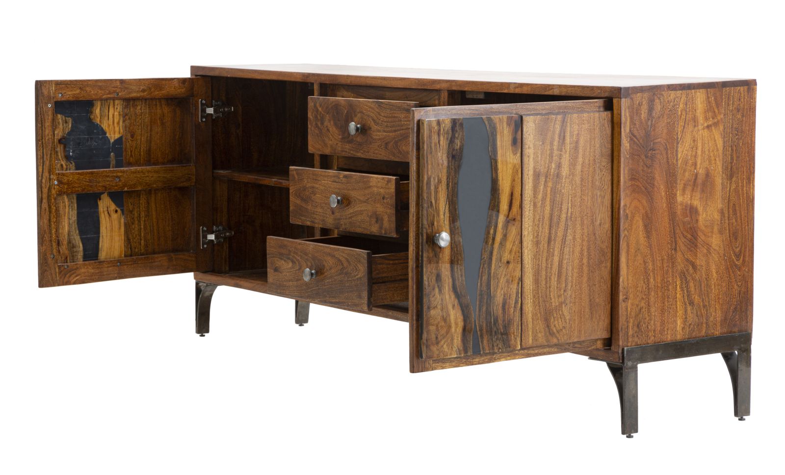 Elegante kast van massief acaciahout met twee deuren en twee lades. De unieke afwerking met hars in de deuren geeft een vleugje kleur en moderniteit aan dit uiterst elegante en klassieke meubelstuk.