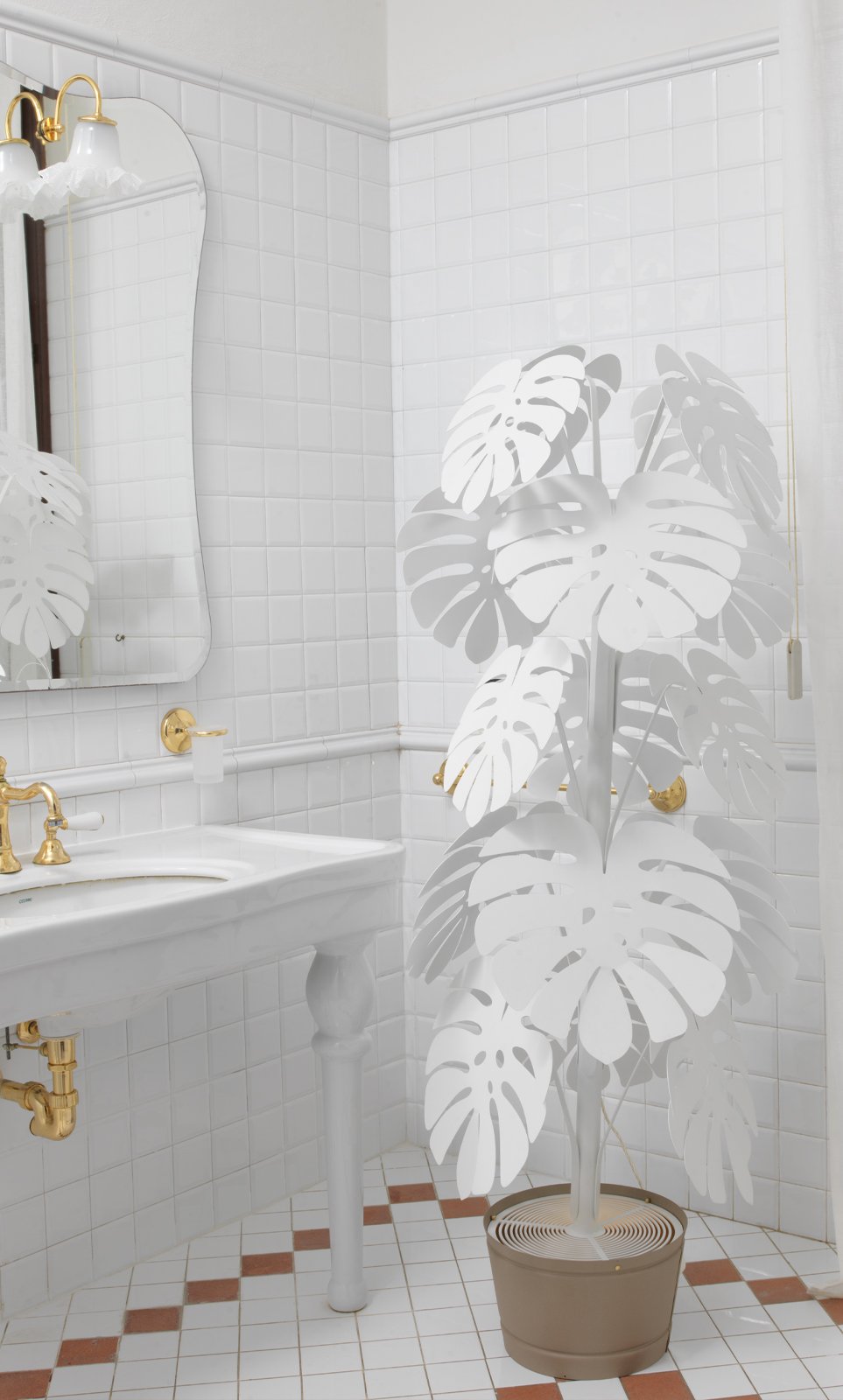 De karakteristieke vormen van de lijn zijn allemaal aanwezig, vooral omdat dit stuk niets meer is dan een compositie. De twee elementen zijn de grote Monstera-plant uit dezelfde collectie en een lampenhouder. Het doel van de lamp is om de ruimte te verlichten, wellicht aangevuld met deze grote, bladerrijke lamp als natuurlijk accent. Het zal er ongetwijfeld prachtig uitzien, zelfs omringd door andere planten, echt of nep!