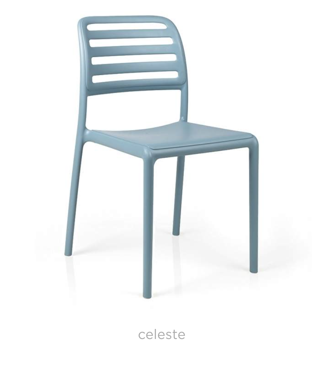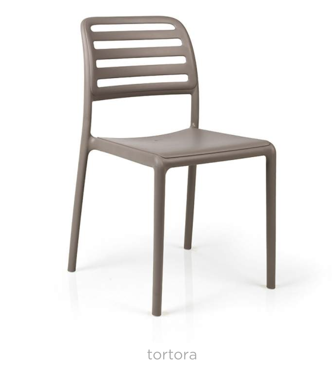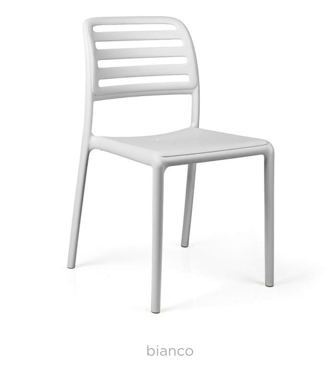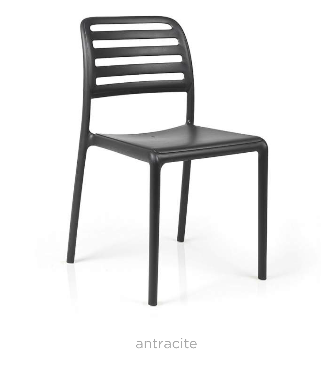 Strakke lijnen voor een lichtgewicht, praktische en comfortabele stoel zonder armleuningen. Costa is een buitenstoel met een rugleuning van latten van glasvezelversterkte kunststof: een enkele, naadloze kunststofbuis met afgeronde profielen en hoeken.