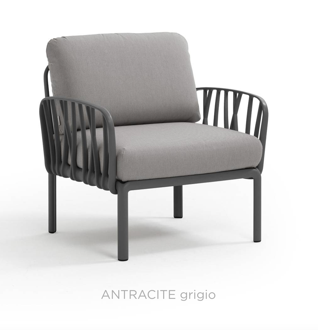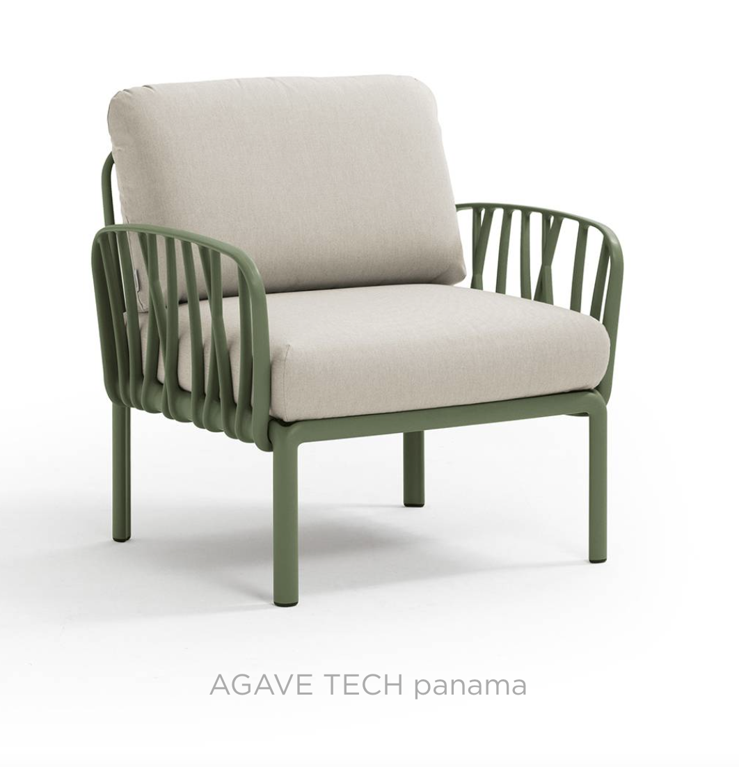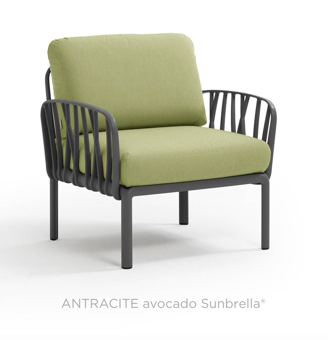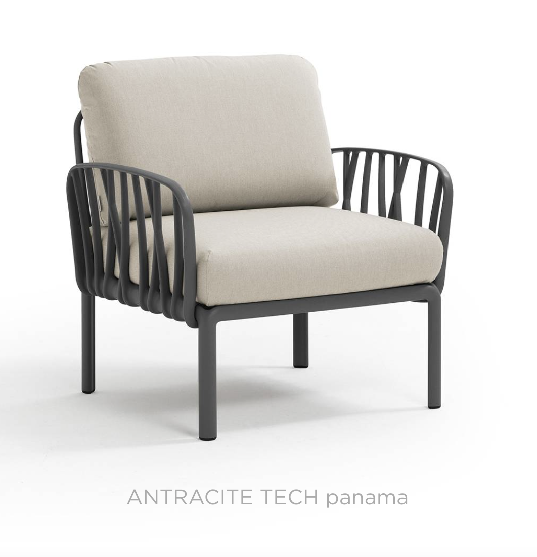 Ontspannende fauteuil met glasvezelversterkte kunststof en gewatteerde armleuningen. Verkrijgbaar als los element of als onderdeel van grotere sets uit de Komodo modulaire zitmeubelcollectie.