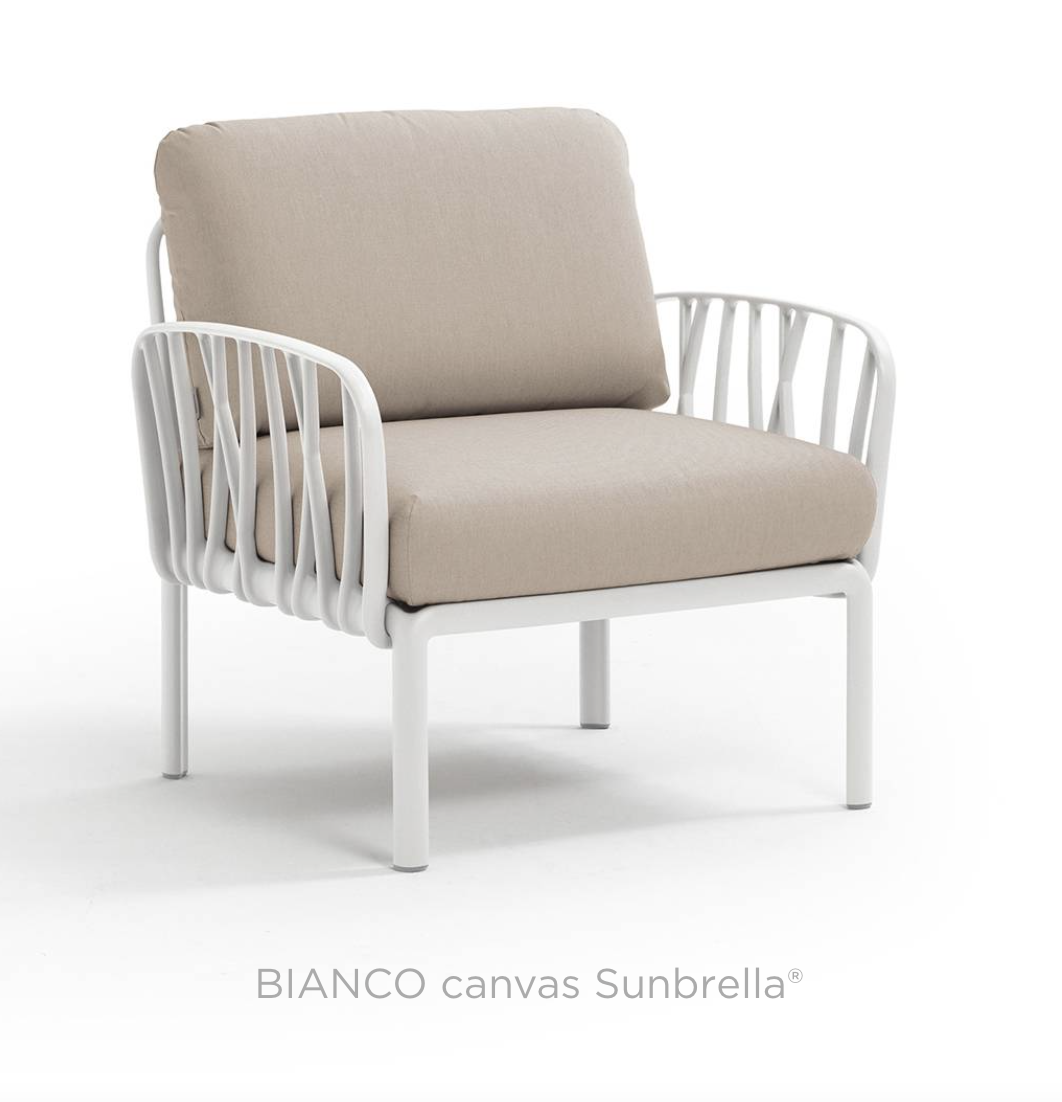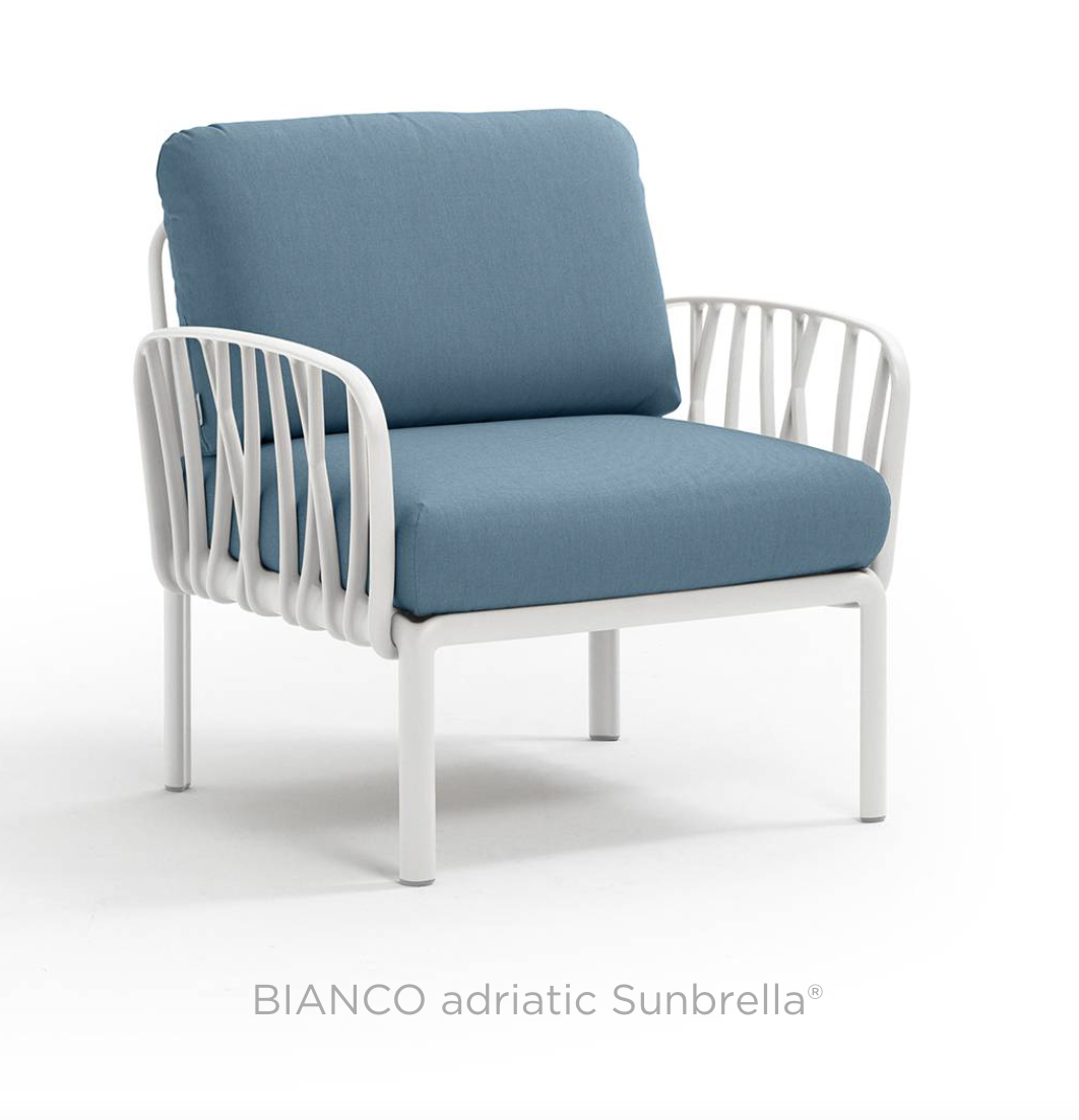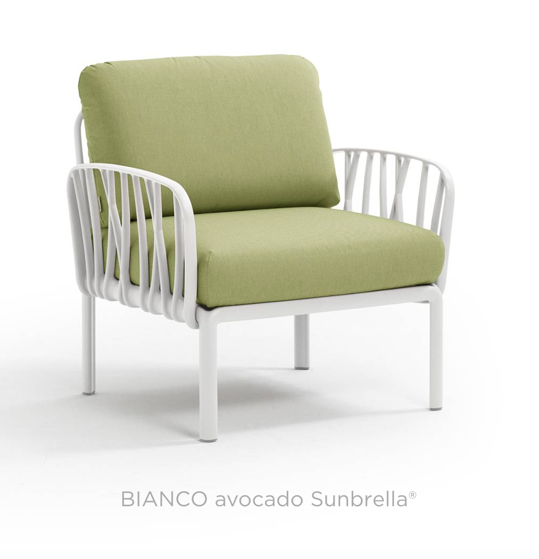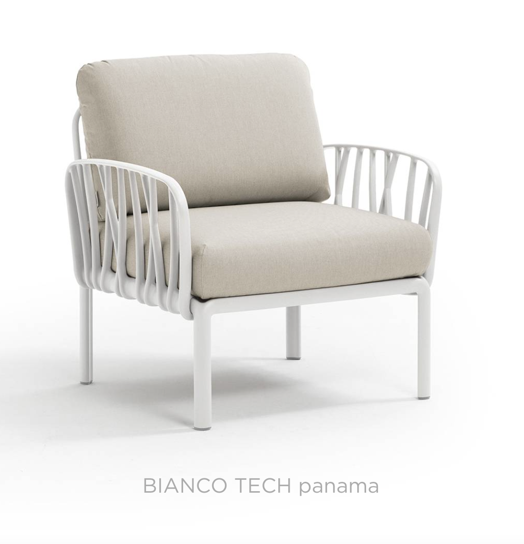 Ontspannende fauteuil met glasvezelversterkte kunststof en gewatteerde armleuningen. Verkrijgbaar als los element of als onderdeel van grotere sets uit de Komodo modulaire zitmeubelcollectie.