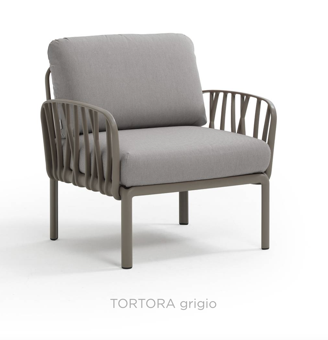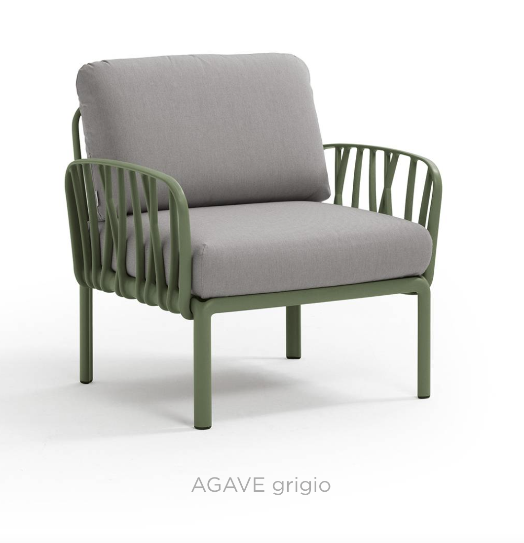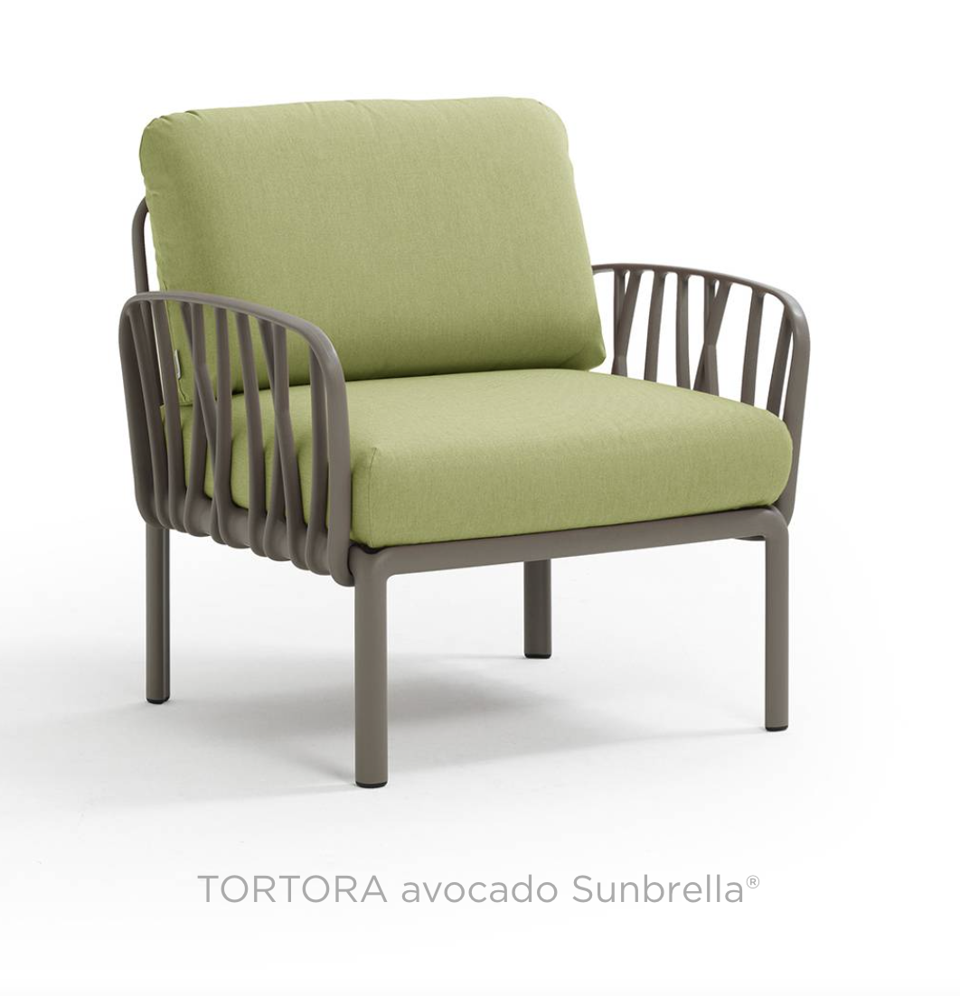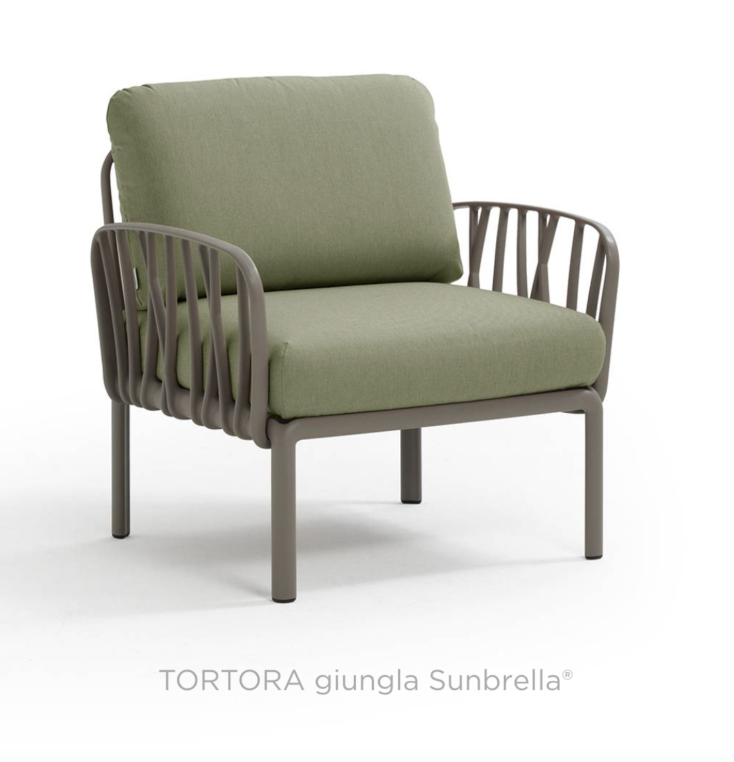 Ontspannende fauteuil met glasvezelversterkte kunststof en gewatteerde armleuningen. Verkrijgbaar als los element of als onderdeel van grotere sets uit de Komodo modulaire zitmeubelcollectie.