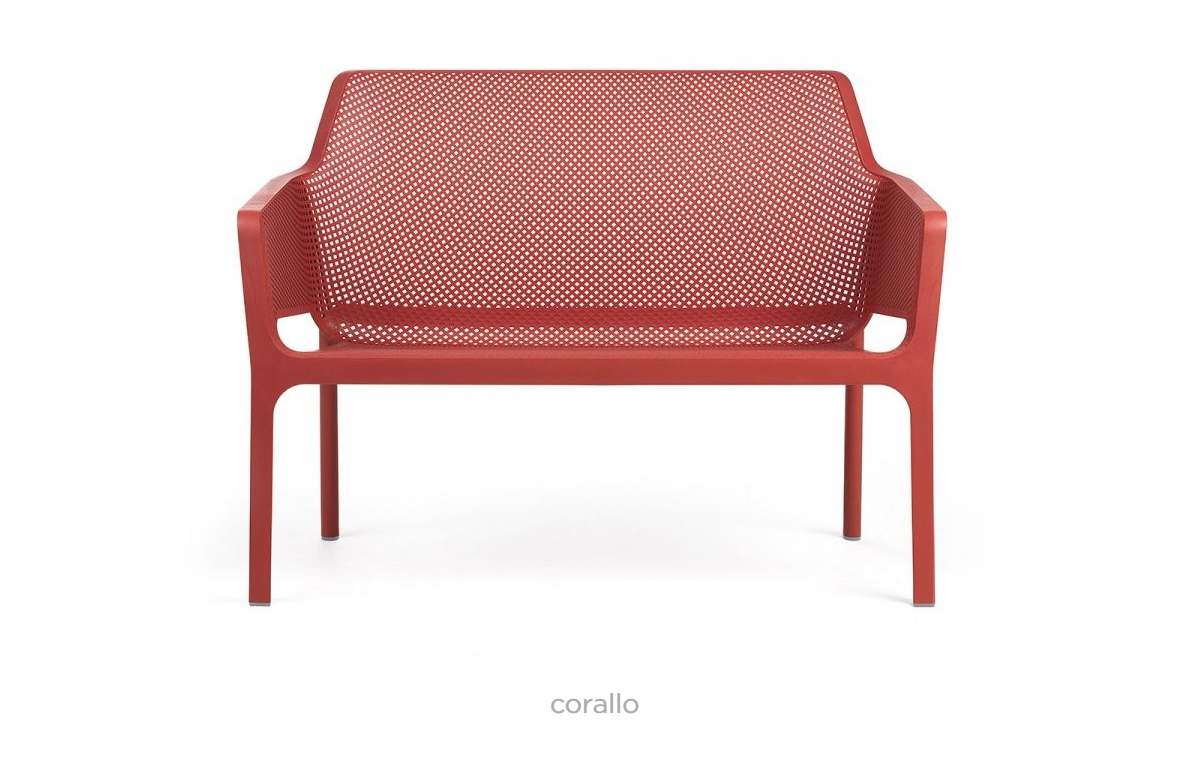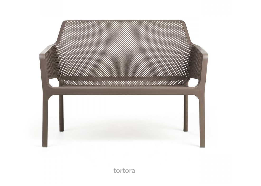 De romantische en sfeervolle Net Bench is een tweepersoons buitenbank gemaakt van glasvezelversterkte kunststof. Met een vierkant en radiaal perforatiepatroon heeft de bank strakke lijnen, een naadloos slank profiel en is verkrijgbaar met een breed scala aan kussens.