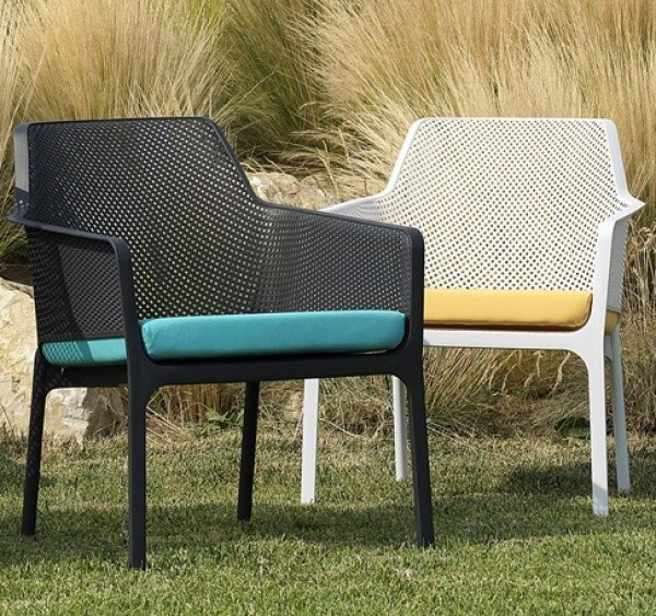 Een bekroonde fauteuil van glasvezelversterkt kunststof met stoffen kussens, verkrijgbaar in verschillende vormen. De Net Relax fauteuil is mat en voelt prettig aan, met een vierkant en radiaal perforatiepatroon over het driedimensionale oppervlak van de zitting.