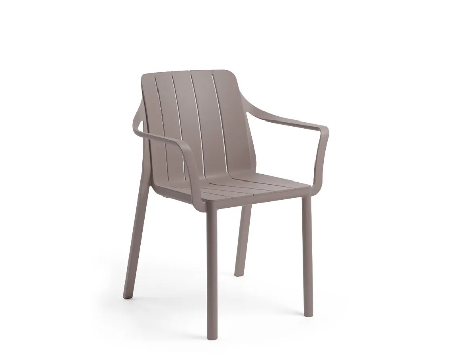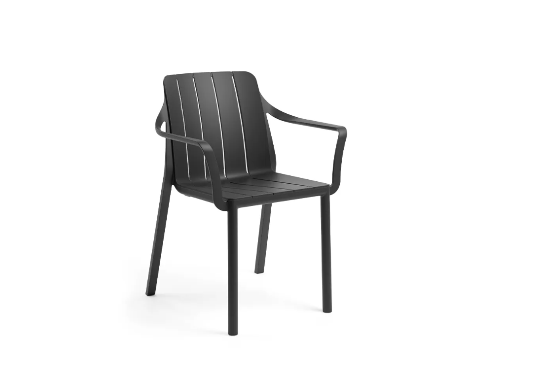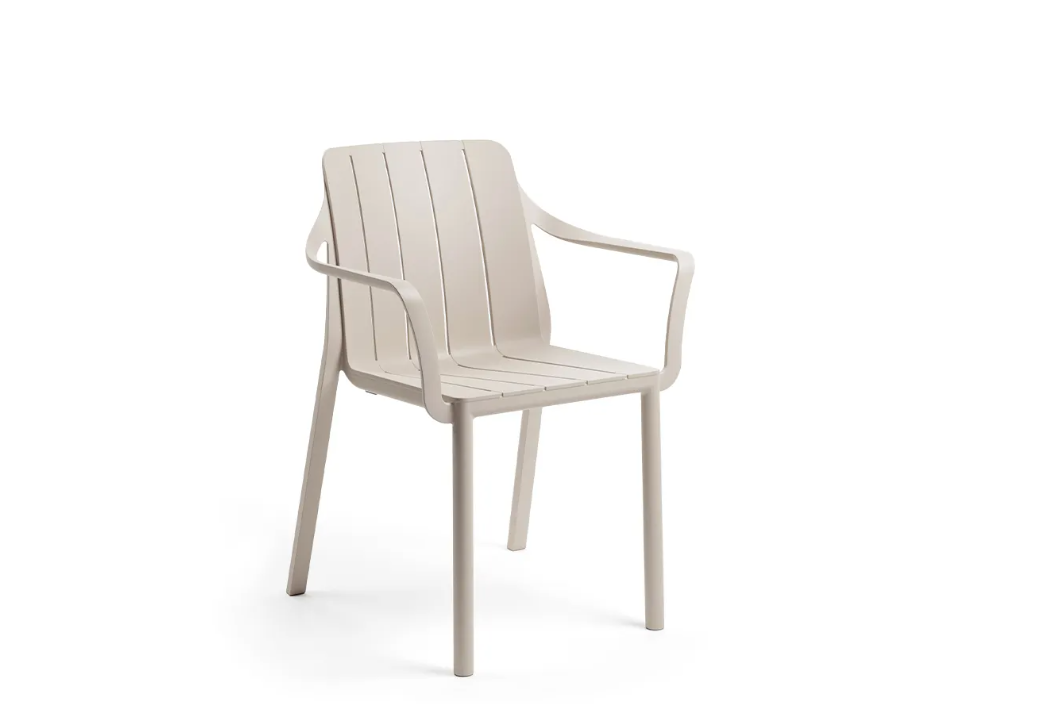 Een groene ziel en afgeronde lijnen kenmerken de Tiberina lattenstoel met armleuningen en ronde poten.