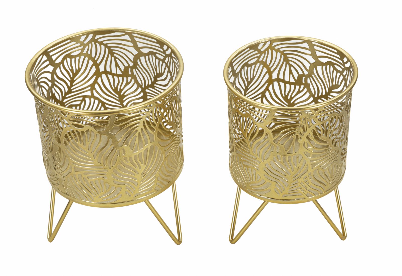 Een paar vergulde metalen plantenpotten, elegant versierd met bladmotieven. Compleet met vergulde metalen onderstellen. De potten zijn van de onderstellen te verwijderen.