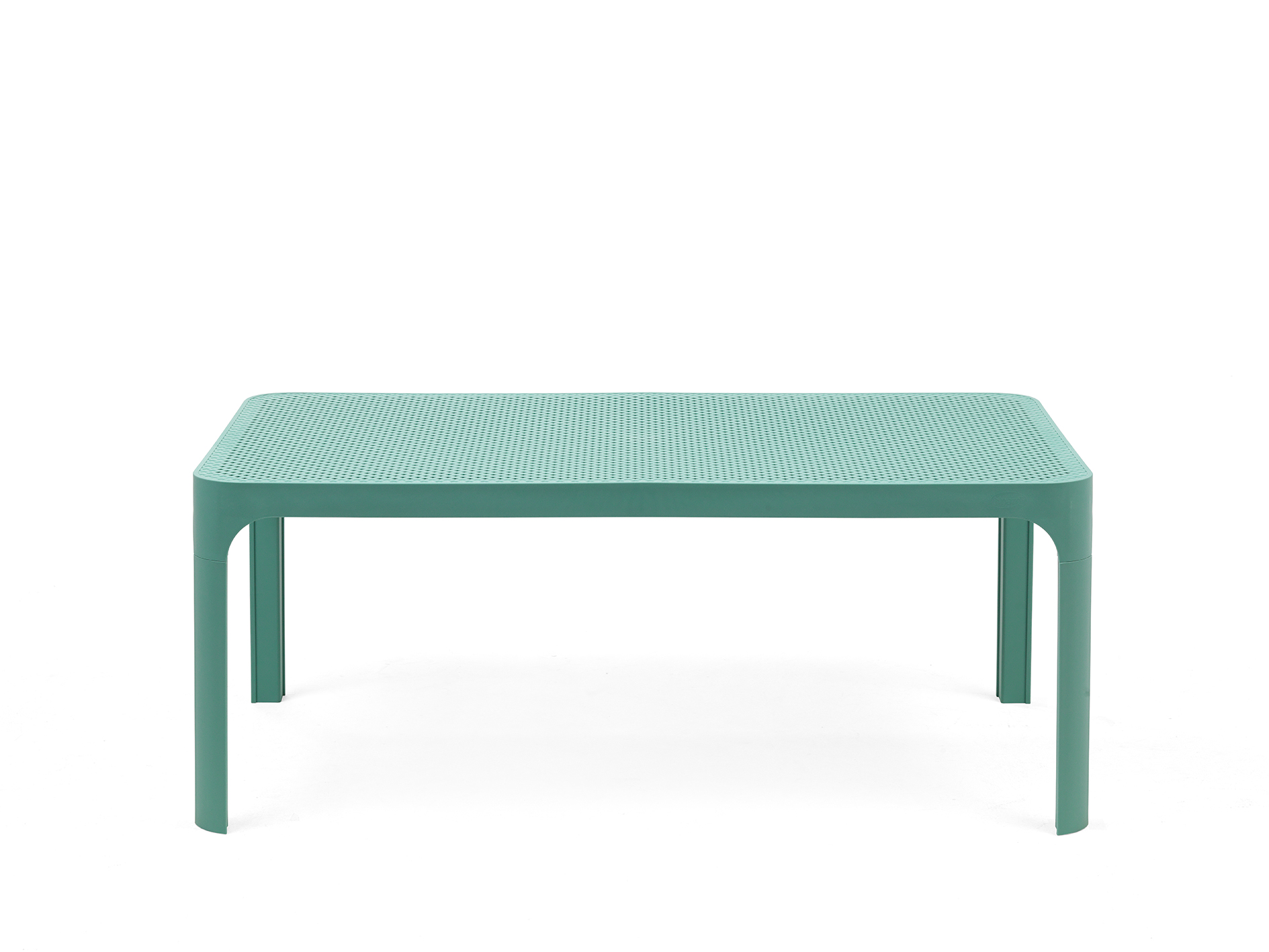 Elegante bijzettafel van door en door gekleurd glasvezelhars met een rechthoekig blad, gekenmerkt door een geperforeerd patroon dat het leidmotief van de gehele Net-collectie weerspiegelt.