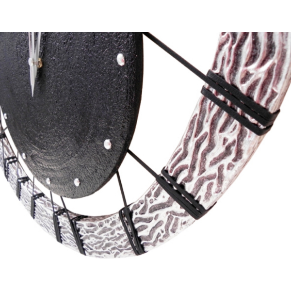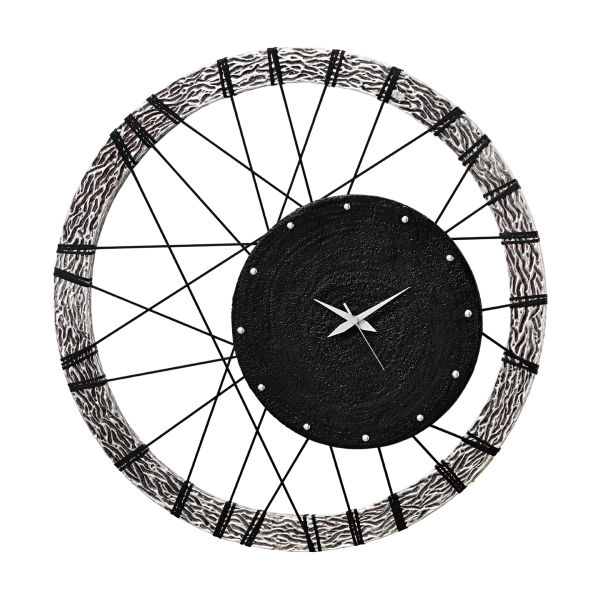 Klok met een ronde lijst, handgedecoreerd met zilverfolie. Het centrale element hangt aan koorden.