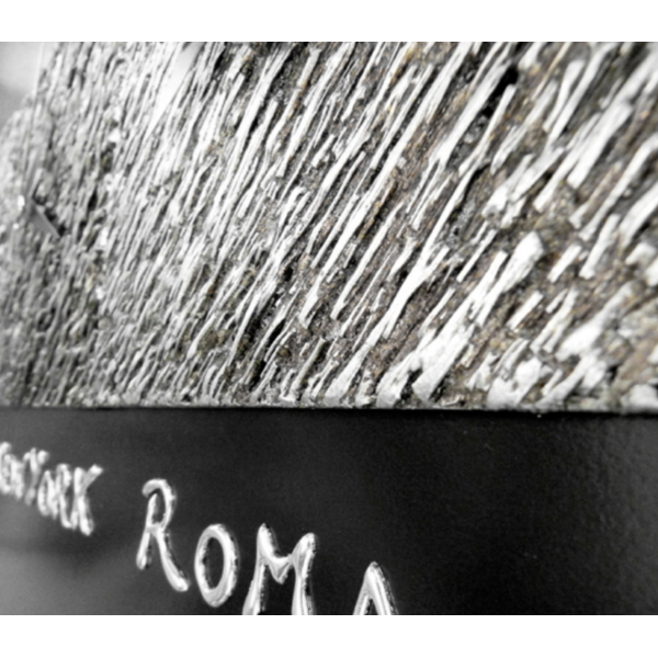 Koffiekleurig gelakt canvas frame met zes composiet keramische elementen, handgedecoreerd met hars en zilverblad. Reliëfletters.