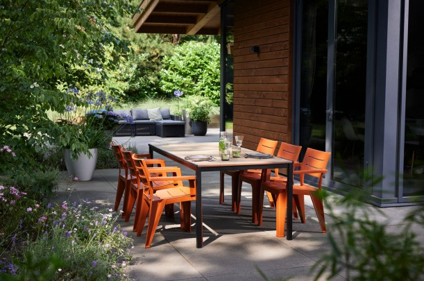De tafel is stevig, stabiel en biedt plaats aan maximaal 6 personen, waardoor hij ideaal is voor middelgrote buitenruimtes zoals tuinen, terrassen en veranda's.