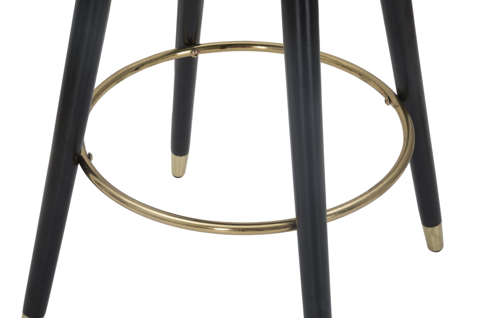 Crèmekleurige, gestoffeerde fluwelen barkruk met houten poten, een ronde voetensteun en gouden metalen pootversieringen die een vleugje elegantie en verfijning toevoegen.