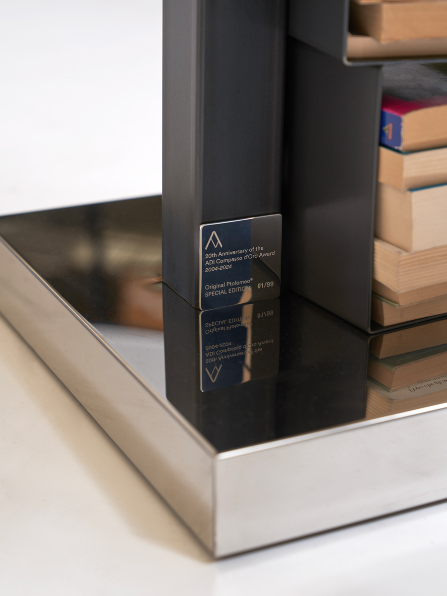 Ontworpen door Bruno Rainaldi, winnaar van de Compasso d'Oro in 2004 , is Original Ptolomeo ontstaan vanuit observatie in plaats van een formeel proces. Het vertaalt een eenvoudig maar geniaal idee naar een meubelaccessoire: een stapel boeken transformeren tot een designobject . Een boekenkast die even "alledaags" als gedurfd is, is uitgegroeid tot een eigentijds icoon , een harmonieus kunstwerk en, zoals een kunstwerk betaamt, ter bescherming van zichzelf, voorzien van de handtekening van de ontwerper op de voet.