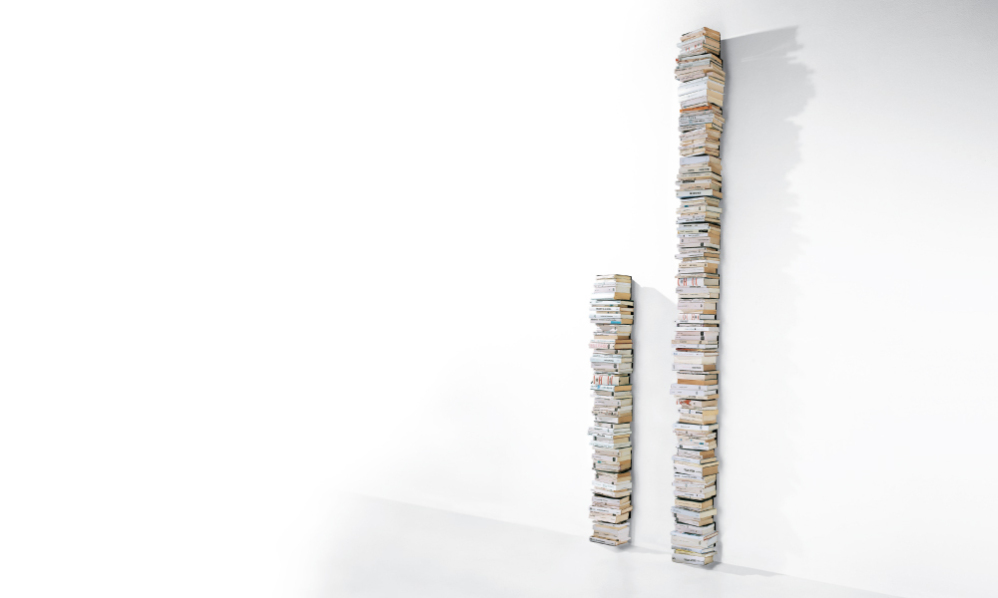 Een stapel boeken die aan het rijzen is, of een kolom die van vloer tot plafond reikt, afhankelijk van de ruimte waarin deze geplaatst wordt.