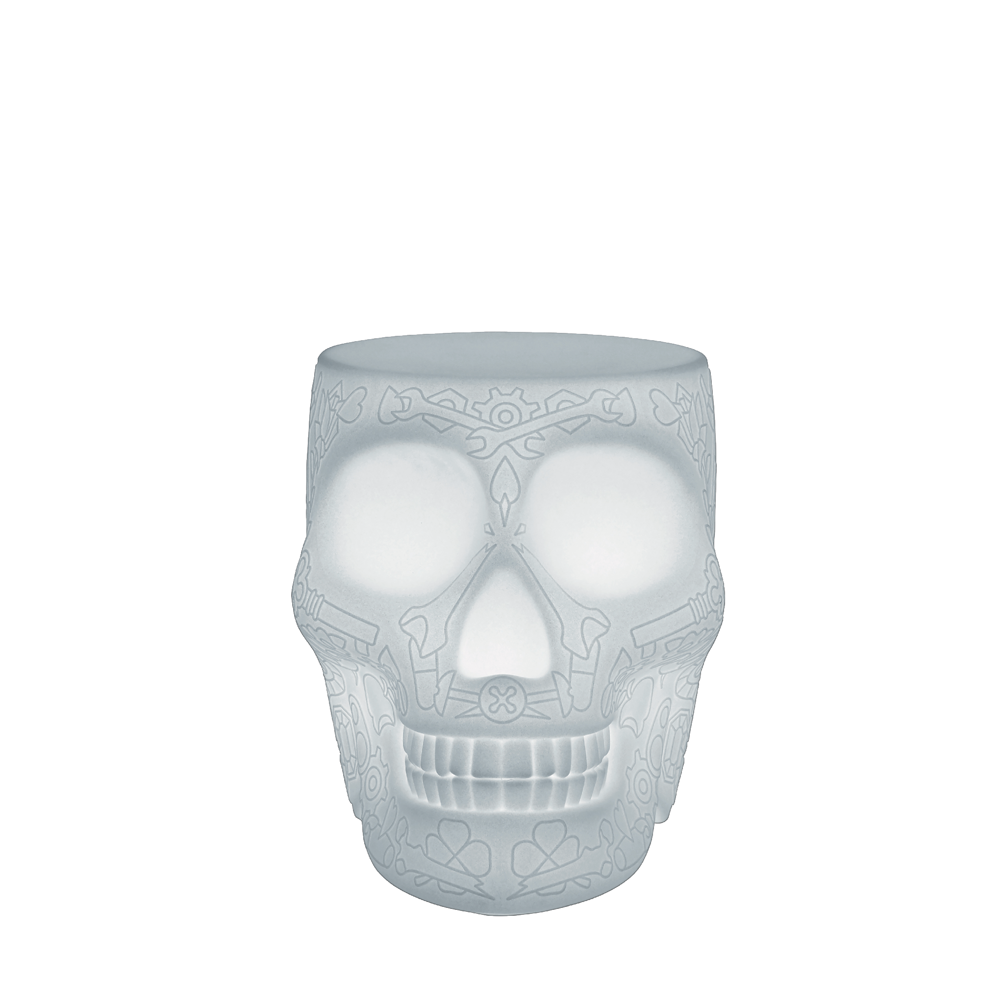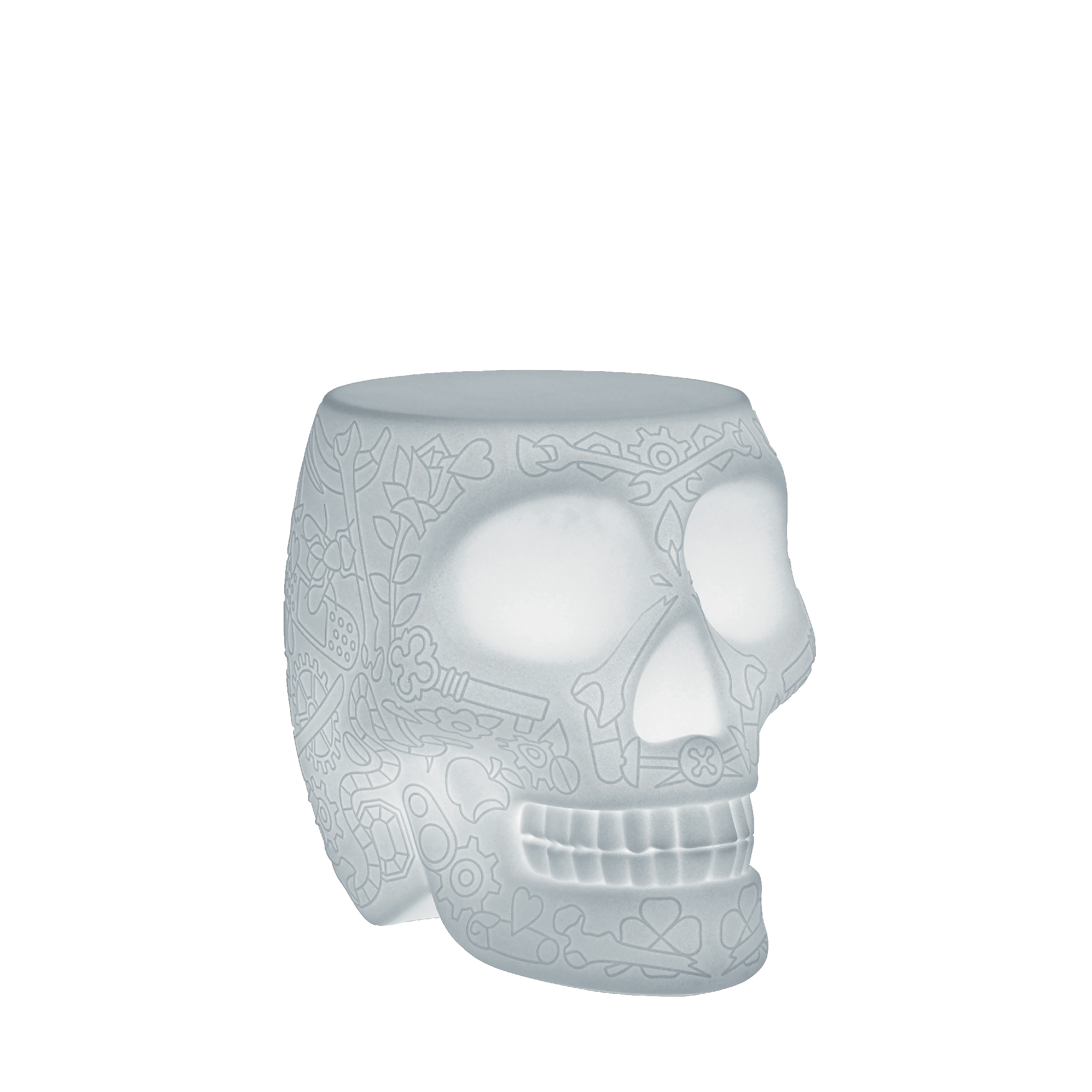 Mexico, ontworpen door Studio Job, is een lamp in de vorm van een schedel met een grafisch patroon op het oppervlak, die zowel als kruk als salontafel kan dienen. De lamp, die doet denken aan de traditionele beschilderde schedels van het land waarnaar hij vernoemd is, is een speelse verwijzing naar de cyclische aard van ons bestaan op aarde, om de dood te verdrijven en het leven te vieren. Geschikt voor lounges, eetkamers en buitenruimtes. De lamp is draadloos, heeft een oplaadbare batterij, een LED-lamp met 16 verschillende verwisselbare RGB-kleuren en kan op afstand worden gedimd.