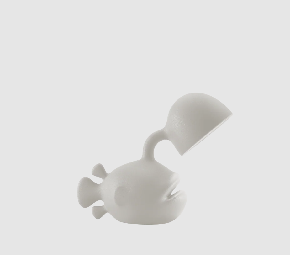 De Abyss tafellamp, ontworpen door Dai Sugasawa, valt op door zijn gedurfde visvorm, gemaakt van recyclebaar polyethyleen.