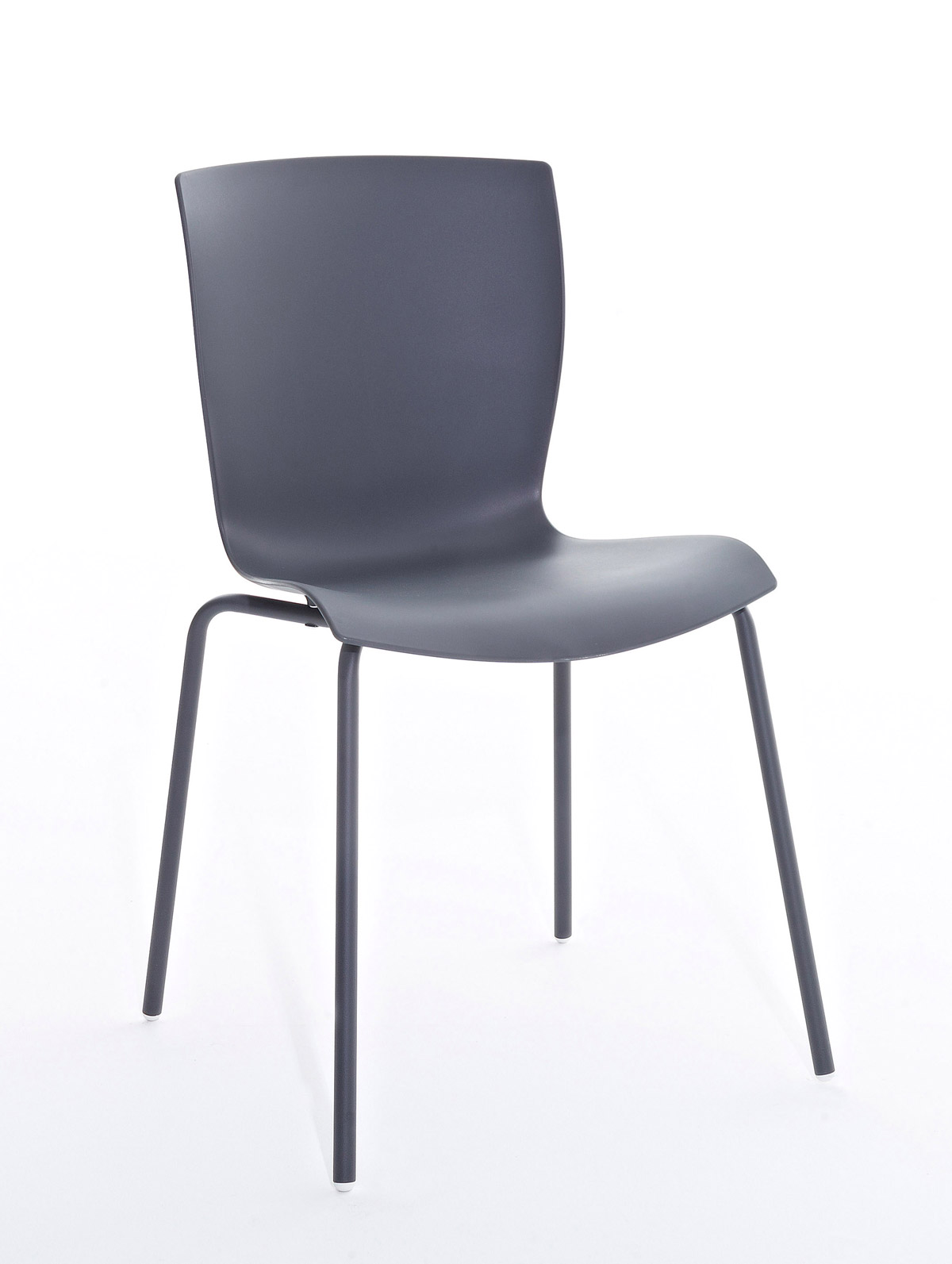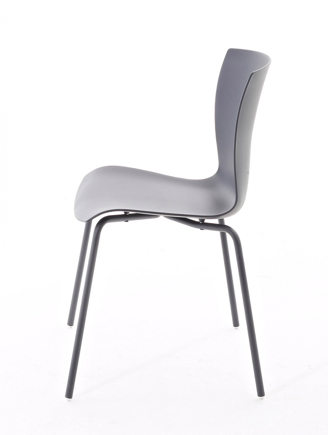 Stapelbare stoel met stalen frame en zitting van zacht aanvoelend polypropyleen.
