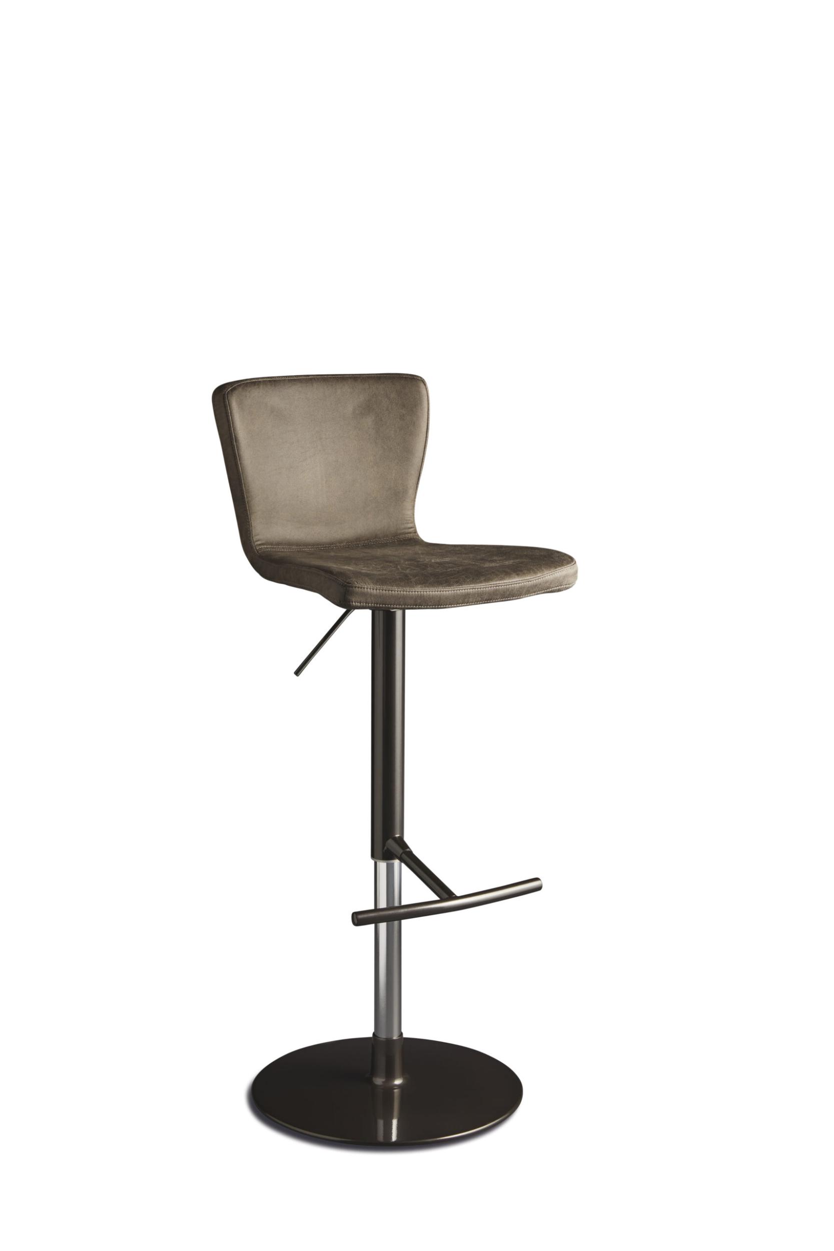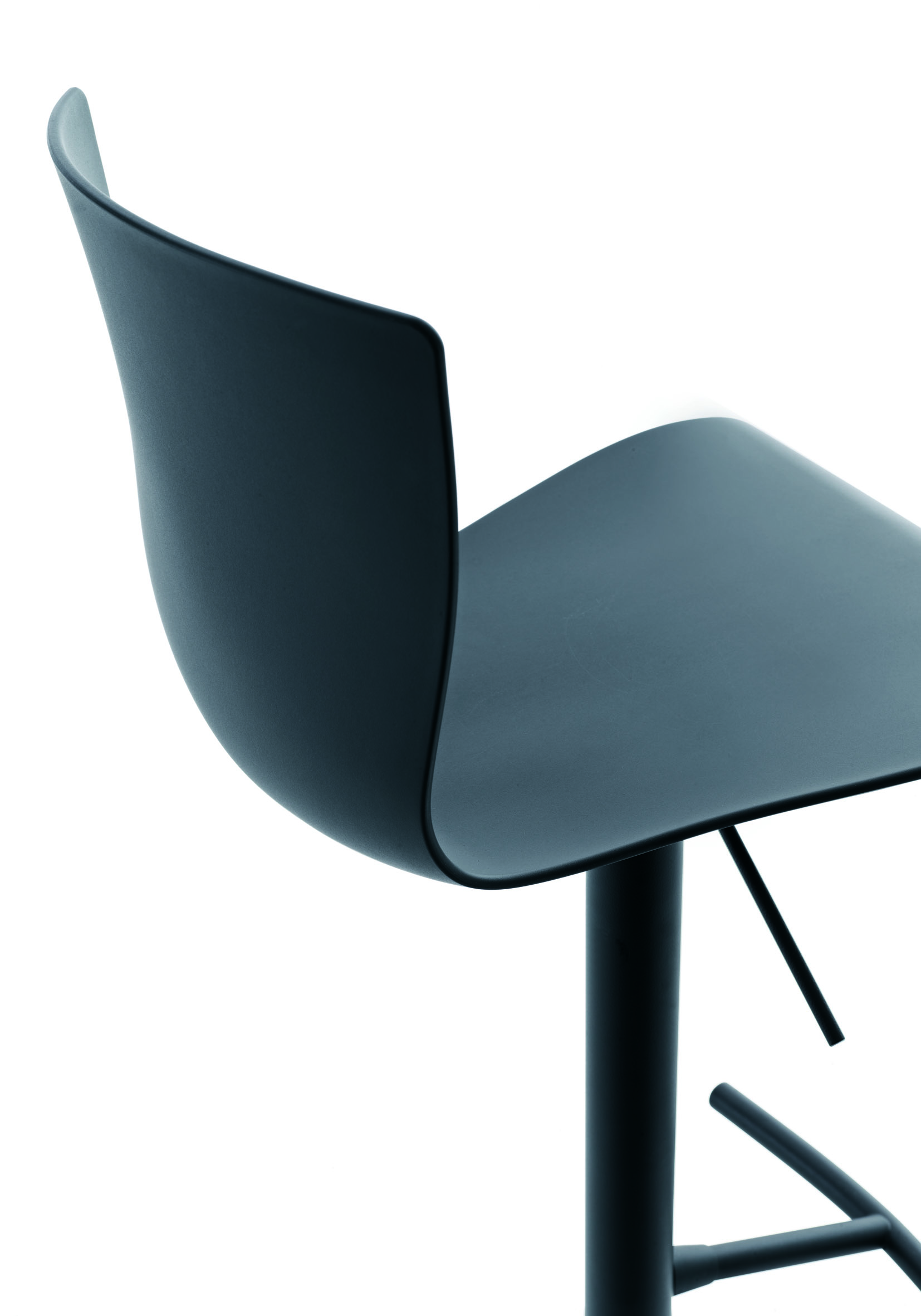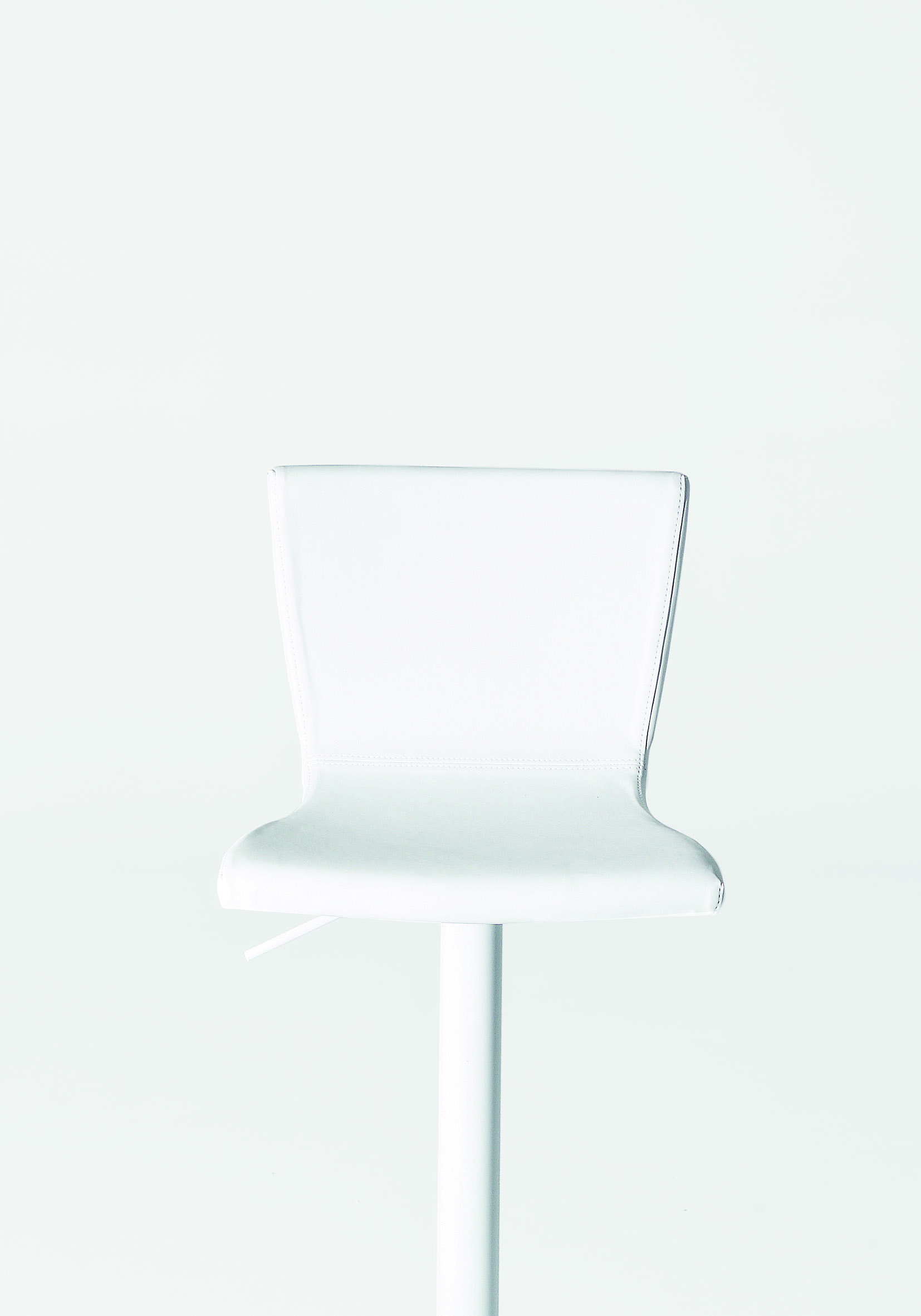 In hoogte verstelbare kruk met frame van aluminium en staal, stalen zuiger en draaibare zitting van zacht aanvoelend polypropyleen of bekleed met stof/kunstleer.