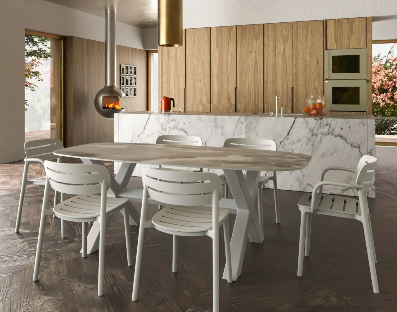 Ondanks hun strakke vormgeving hebben deze tuintafels een sterke persoonlijkheid en passen ze zich aan verschillende ruimtebehoeften aan, van de kleinste tot de grootste ruimtes, zowel binnen, op de werkplek als buiten.