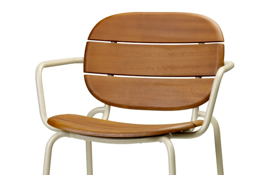 De zitting en rugleuning zijn gemaakt van massief Sapelli mahoniehouten latten, die speciaal behandeld zijn om bestand te zijn tegen gebruik buitenshuis , slecht weer en UV-straling.