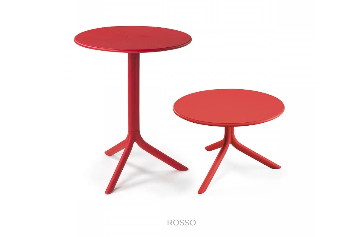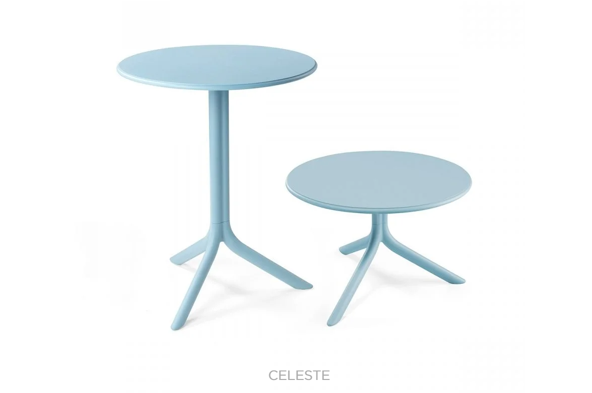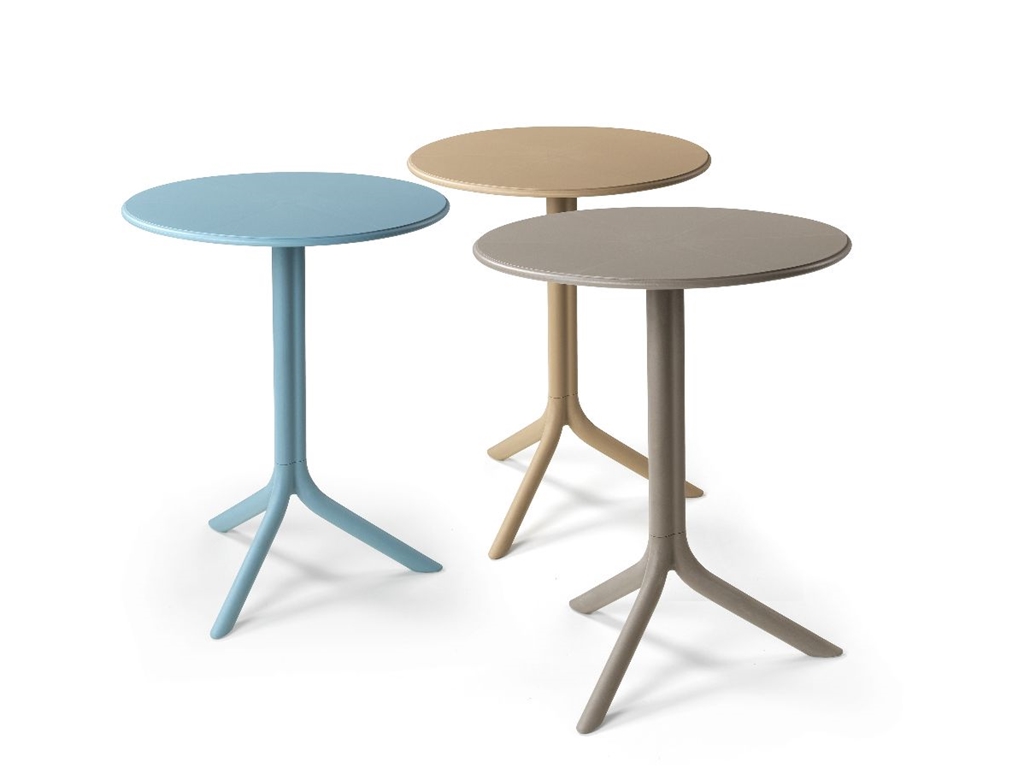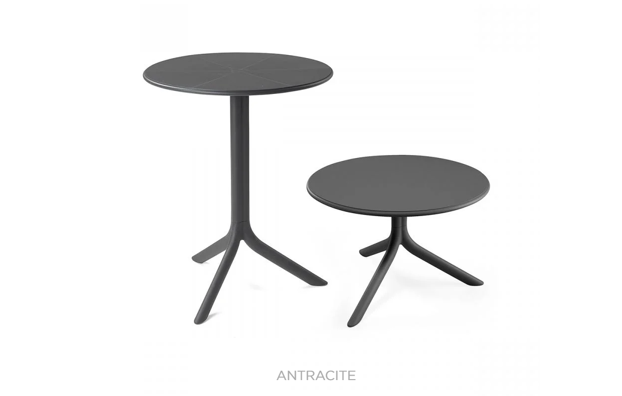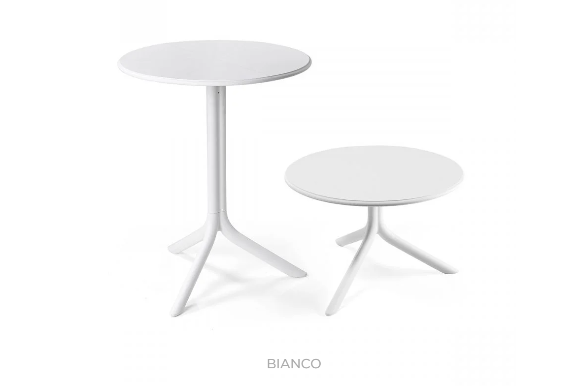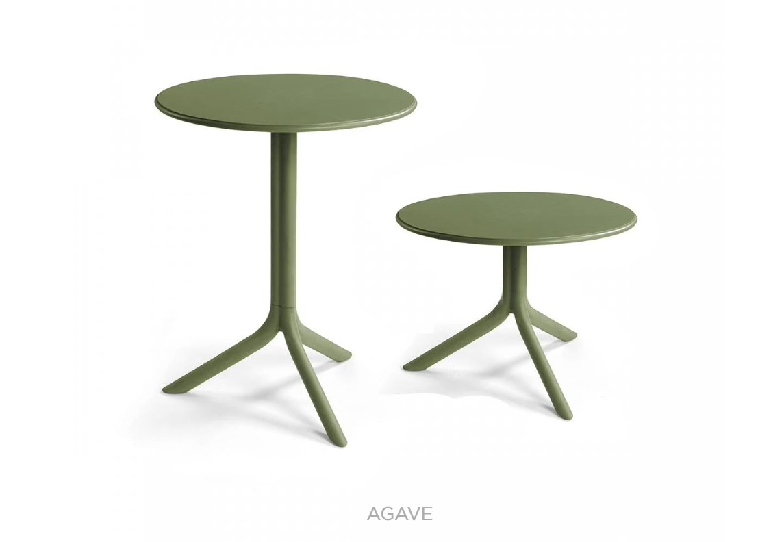 Bijzettafel van glasvezelhars met een rond blad en een driepotige voet, ideaal voor buitengebruik maar ook perfect als decoratief element binnenshuis. Eenvoudig te monteren en demonteren, en wordt geleverd met een handige set waarmee u kunt kiezen tussen twee verschillende hoogtes.