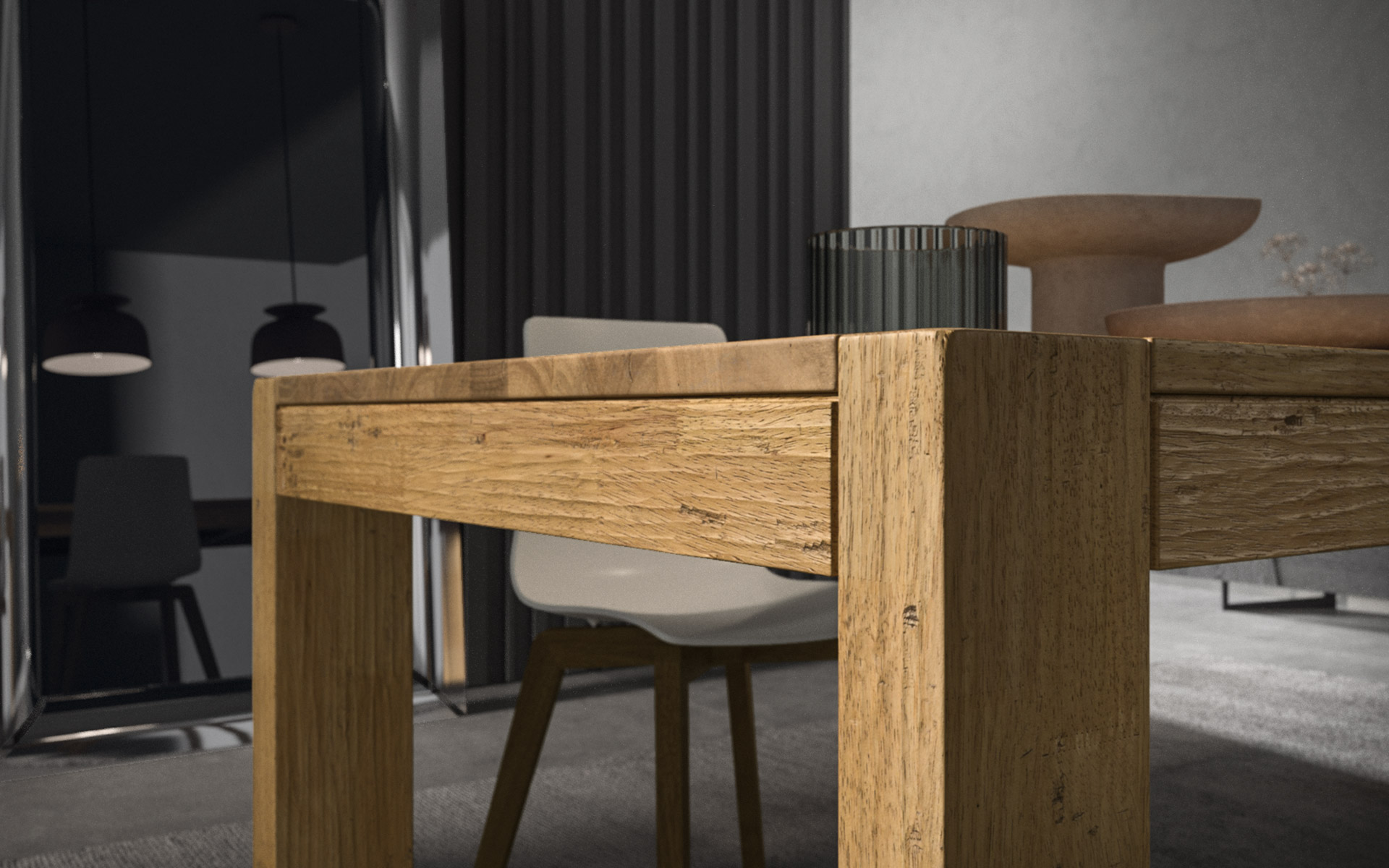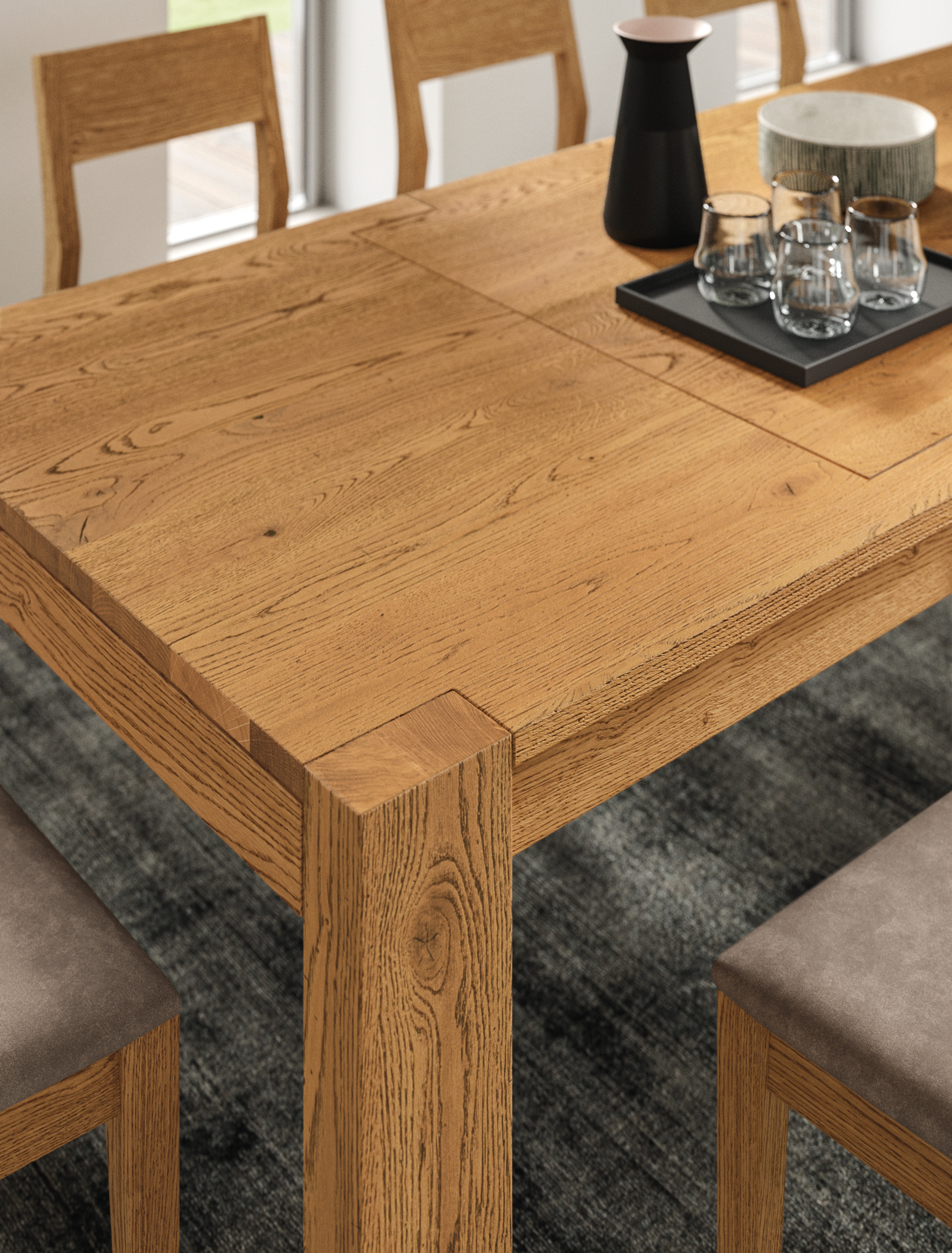 De MOOD-tafel valt op door zijn royale, vierkante poten, die de houtnerf accentueren en de tafel een stoere, oeroude uitstraling geven. De inzetstukken in het tafelblad verwijzen naar de eeuwenoude verbindingstechnieken van meestermeubelmakers, wat een vleugje vakmanschap en uniek karakter toevoegt.