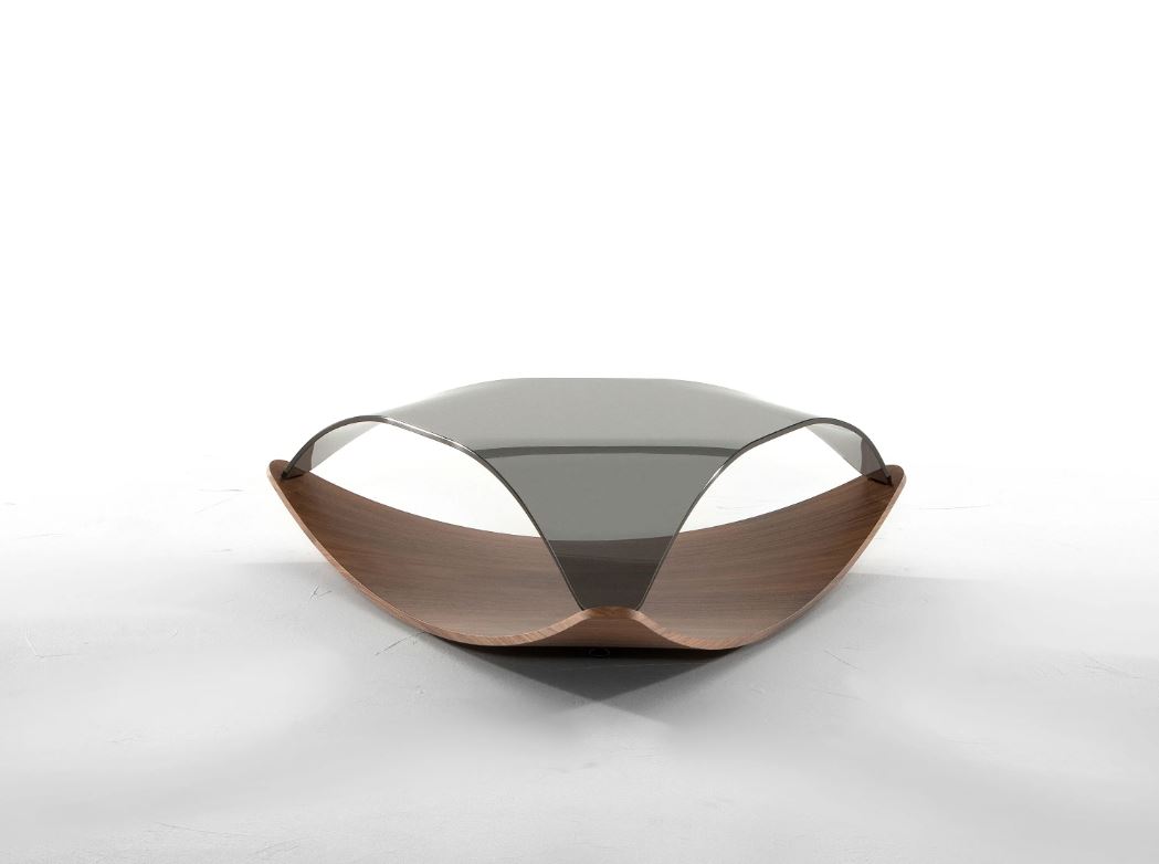 Salontafel van gebogen, gelakt of met hout bekleed MDF met een gebogen glazen blad.