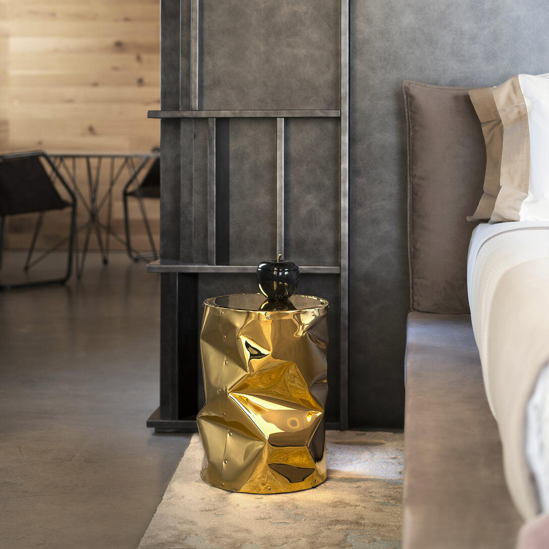 Handgekreukelde aluminium kruk met een massief houten binnenframe. Tab.u is ideaal voor onconventionele woonomgevingen en projectinrichting.