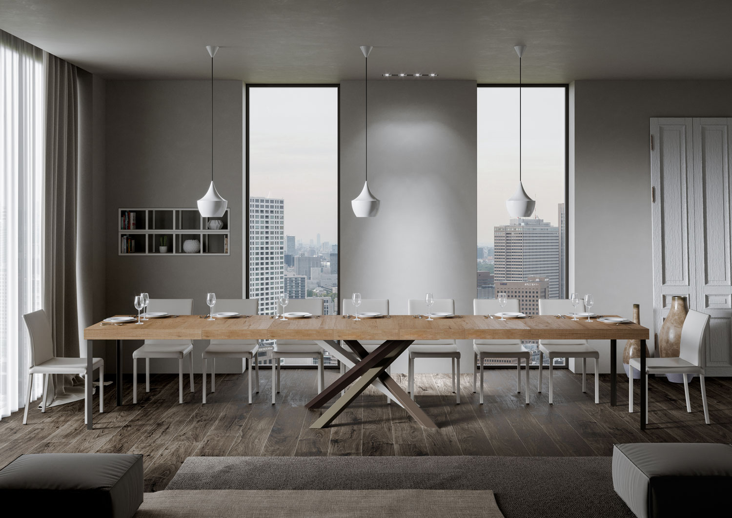 De Volantis Premium uitschuifbare tafel van 200 cm, met zijn verfijnde moderne design, past in elk interieur en is de ideale keuze als eettafel én als stijlvol meubelstuk voor de woonkamer, waar u gasten in stijl kunt ontvangen. De Volantis Premium uitschuifbare tafel kan stapsgewijs worden verlengd tot 460 cm en biedt plaats aan maximaal 18 personen. De tafel is vervaardigd uit melamine panelen, ijzeren poten en een inklapbaar blad met verlengstukken, waardoor hij stabiel en stevig is, zelfs in volledig uitgeschoven toestand. Het uitschuifsysteem, met telescopische aluminium geleiders en de meegeleverde zijsteunen, zorgt ervoor dat de tafel stabiel en stevig blijft, zelfs in volledig uitgeschoven toestand. Wanneer de verlengstukken niet in gebruik zijn, passen ze niet in het tafelblad en moeten ze worden opgeborgen. Itamoby product. Gemaakt in Italië. Afmetingen: Gesloten tafel: L.200 D.90 H.77 cm. Lengte met 1 verlengstuk: 252 cm. Lengte met 2 verlengstukken: 304 cm. Lengte met 3 verlengstukken: 356 cm. Lengte met 4 verlengstukken: 408 cm. Lengte met 5 verlengstukken: 460 cm.