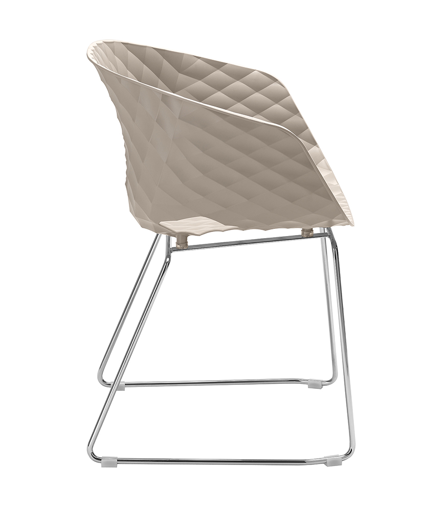 Uni-Ka, een doorontwikkeling van het merk Metalmobil, is een verfijnde fauteuil met een omhullend ontwerp, ontworpen door Et al. De schaal is gemaakt van glasvezelversterkt polypropyleen en heeft een elegante textuur die de esthetiek versterkt.