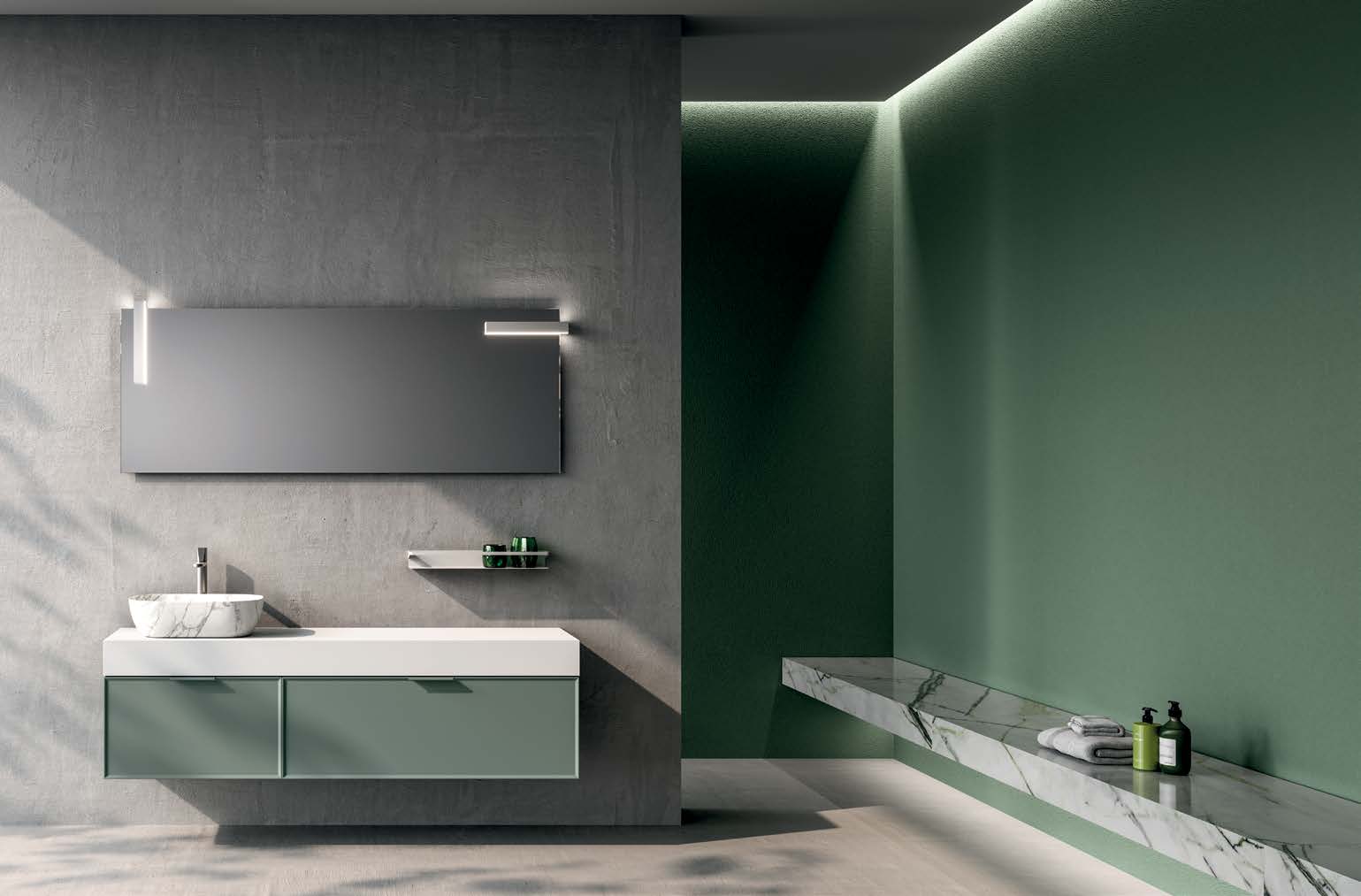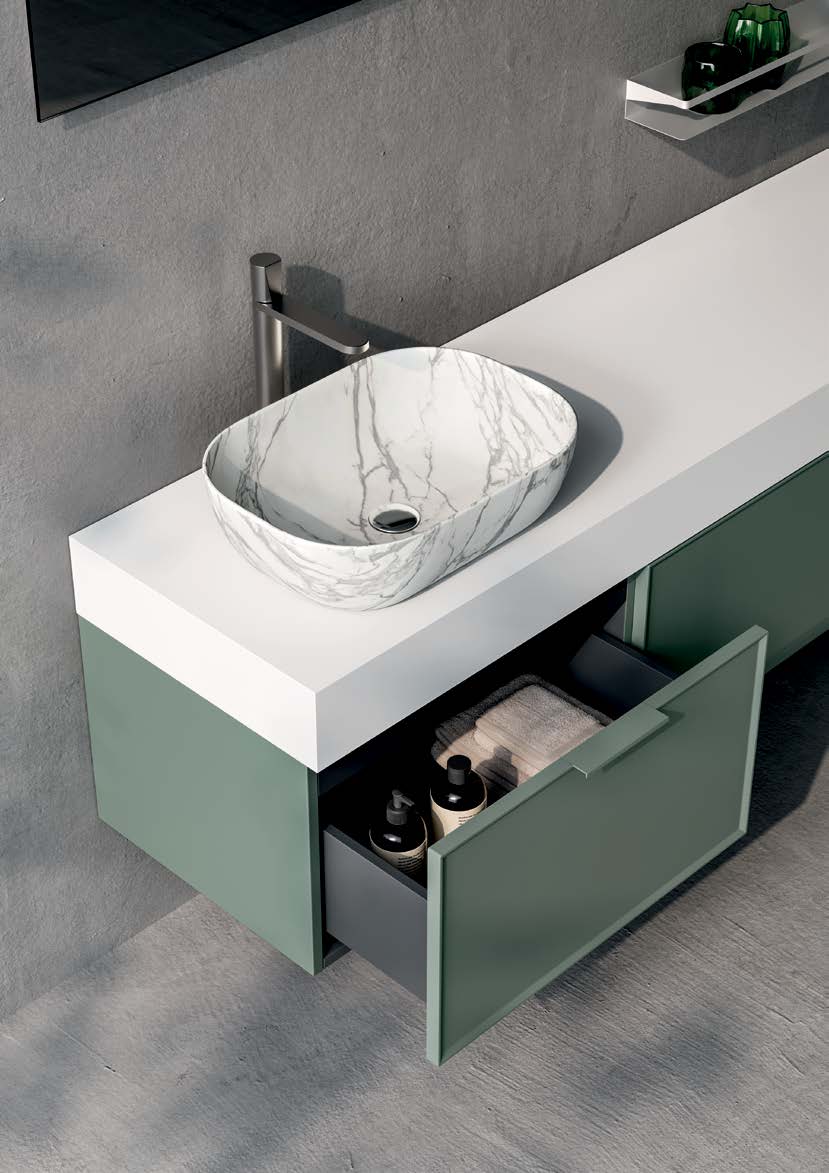 De geïntegreerde spoelbak sluit naadloos aan op het aanrechtblad, terwijl de soft-close lades zorgen voor een stille en soepele sluiting. Een spiegel met optionele ledverlichting completeert het geheel en creëert een lichte en uitnodigende spoelbakomgeving.