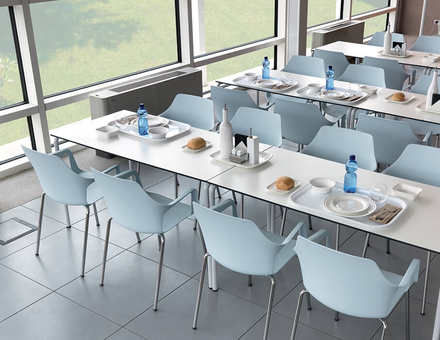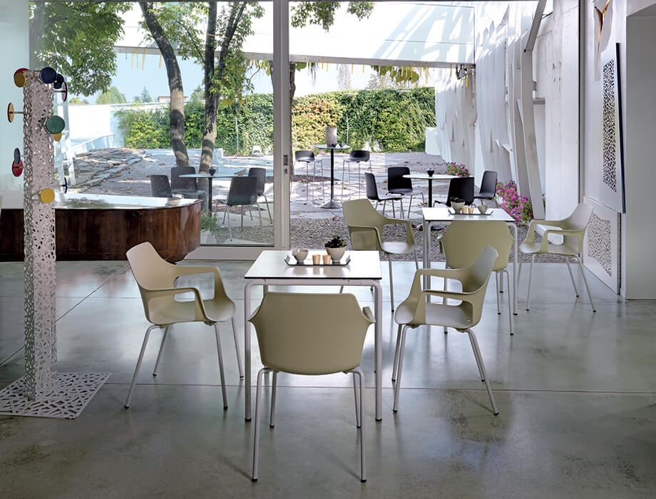 Ze zijn stapelbaar en geschikt voor zowel binnenruimtes, in de verchroomde uitvoering, als buitenruimtes, in de gelakte uitvoering. Het concept is om een collectie producten aan te bieden die bewust beperkt is tot slechts enkele modellen, gericht op de horecasector en daarbuiten, dankzij de veelzijdigheid van het minimalistische ontwerp en de diverse kleurcombinaties voor de schaal en het frame.