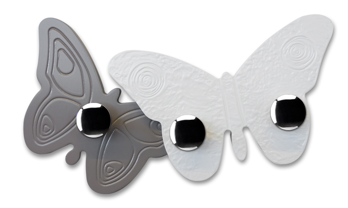 Kapstok met overlappende, gevormde structuren. Eén gegraveerd element met een duifgrijze lakafwerking en één ivoorwit gelakt element met een reliëfstructuur. Drie chromen knoppen.