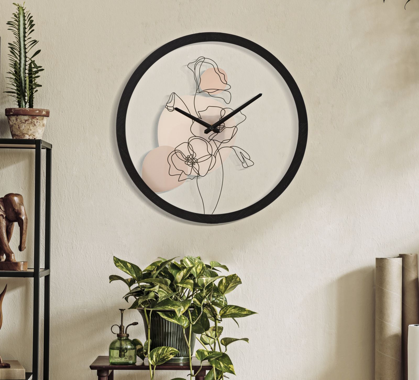 Orologio rotondo da parete dalle linee semplici ed essenziali impreziosito da disegni floreali all'interno del quadrante.